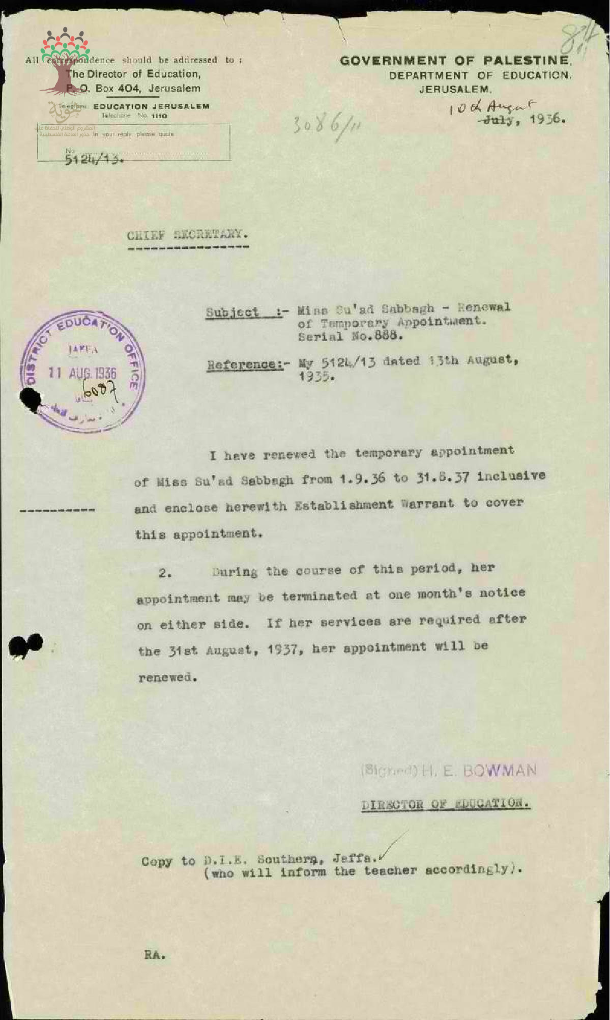 رسالة من مفتش المعارف إلى المعلمة سعاد صباغ يخبرها بتجديد تعينها في الادارة