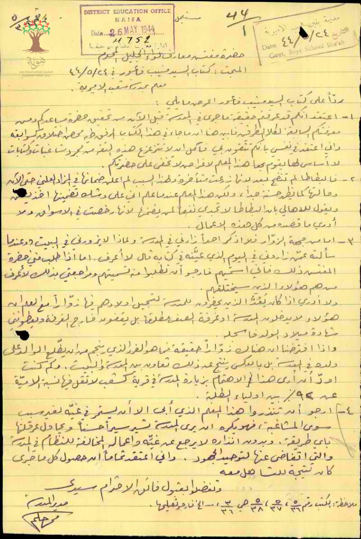 رداً على كتاب المعلم منيب فاعور حول نتيجة زرع البطاطا في حديقة المدرسة كتب مدير المدرسة موضحاً في هذة الرسالة الى مفتش المعارف