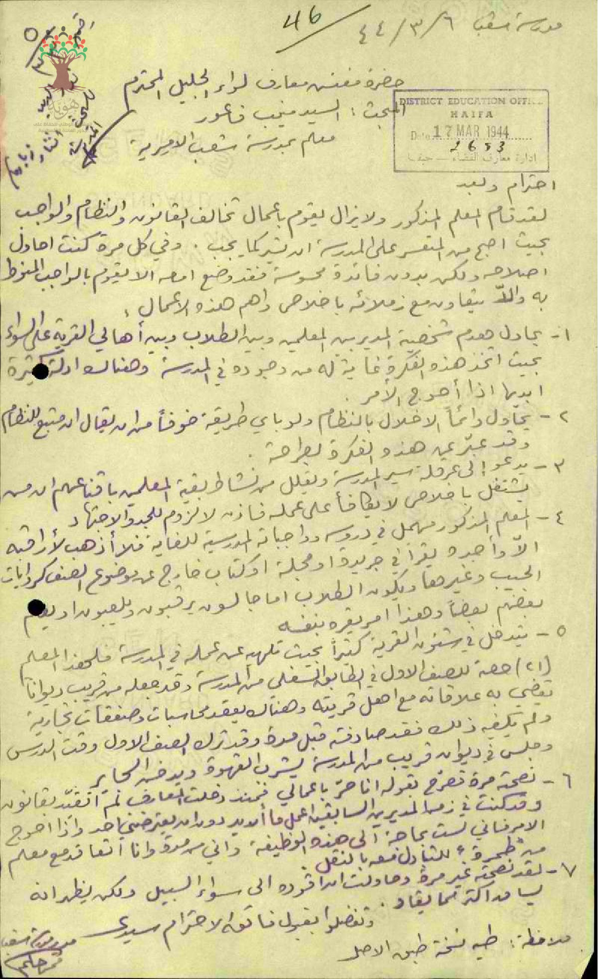 يقدم مدير مدرسة شعب عدة ملاحظات حول اداء المعلم منيب فاعور في المدرسة ويرفعها لمفتش المعارف على امل ايجاد الحل الانسب لضمنا عدم تكرار تجاوزات المعلم المذكور في المدرسة