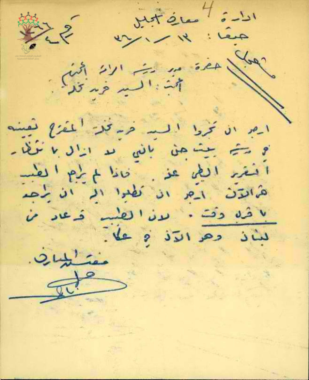 رسالة من مفتش المعارف الى مدير مدرسة بيت جن يطلب فيها التقرير الطبي للمعلم فريد نخلة