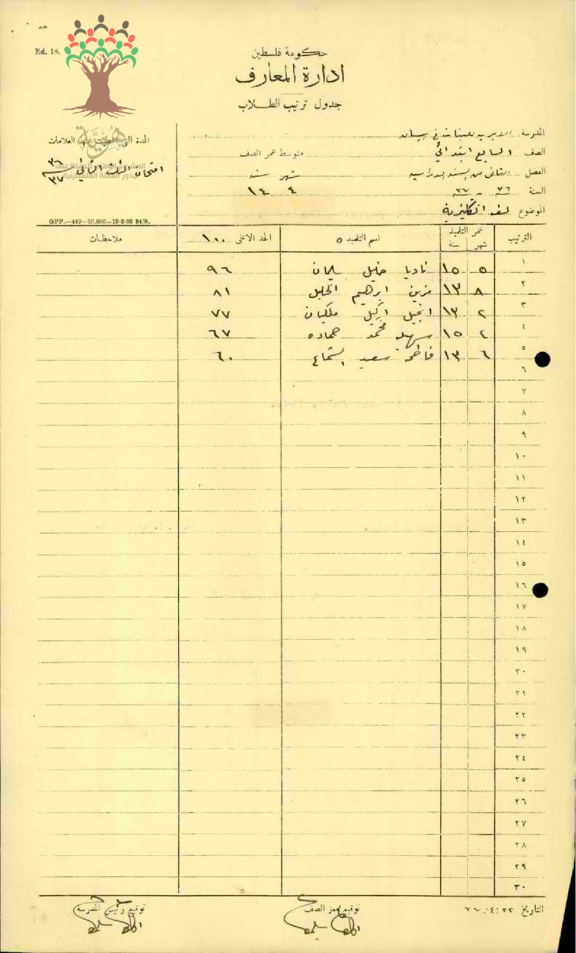 ادارة المعارف جدول ترتيب الطلاب مدرسة الاميرية للبنات صف السابع ابتدائي