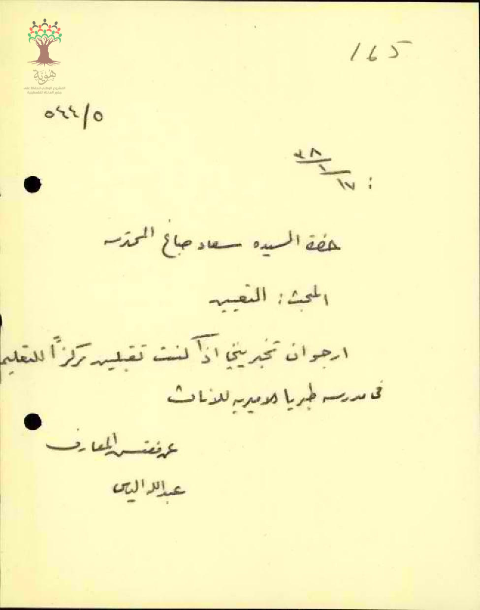 رسالة من مفتش المعارف إلى المعلمة سعاد صباغ يطلب اعلامه إذا كانت تقبل مركز للتعليم في مدرسة طبريا