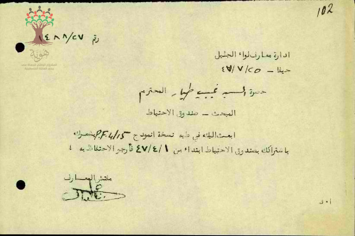 رسالة مفتش معارف الجليل إ لى المعلم نجيب الطيار بخصوص صندوق الإحتياط والممشاركة فيه