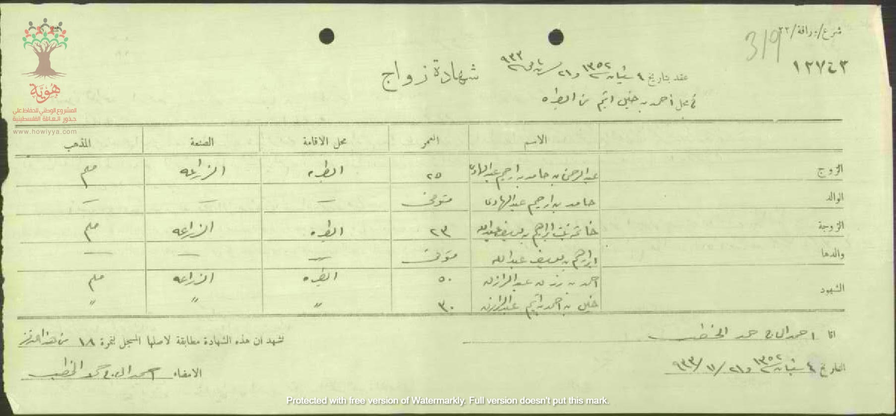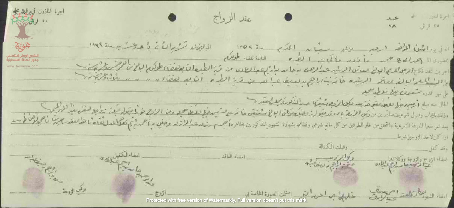 عقد زواج : عبد الرحمن عبد الهادي - خانم عبد الله - الطيرة