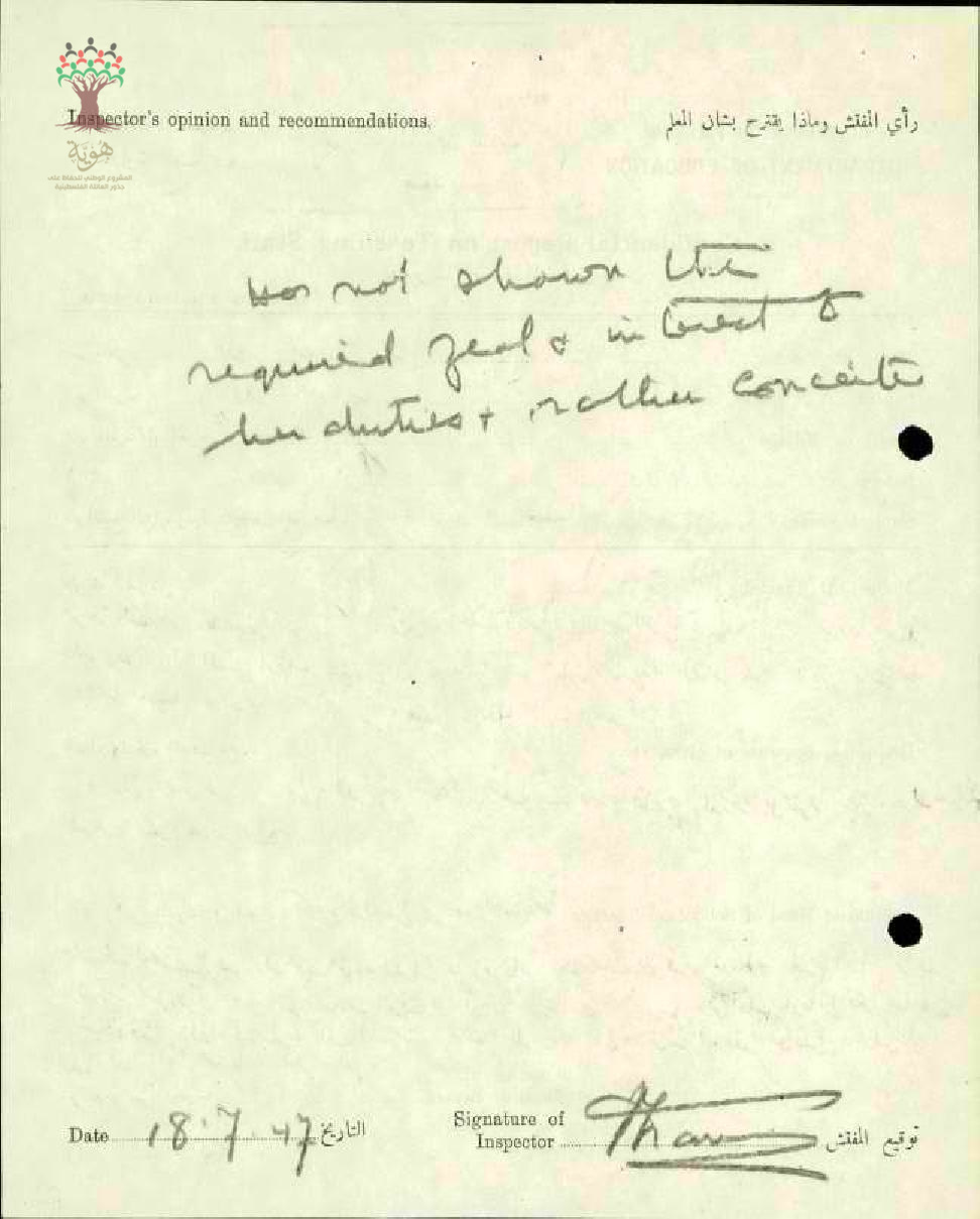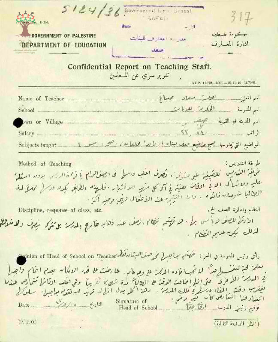 تقرير تفصيلي عن أداء المعلمة سعاد صباغ في مدرسة صفد سنة 1947