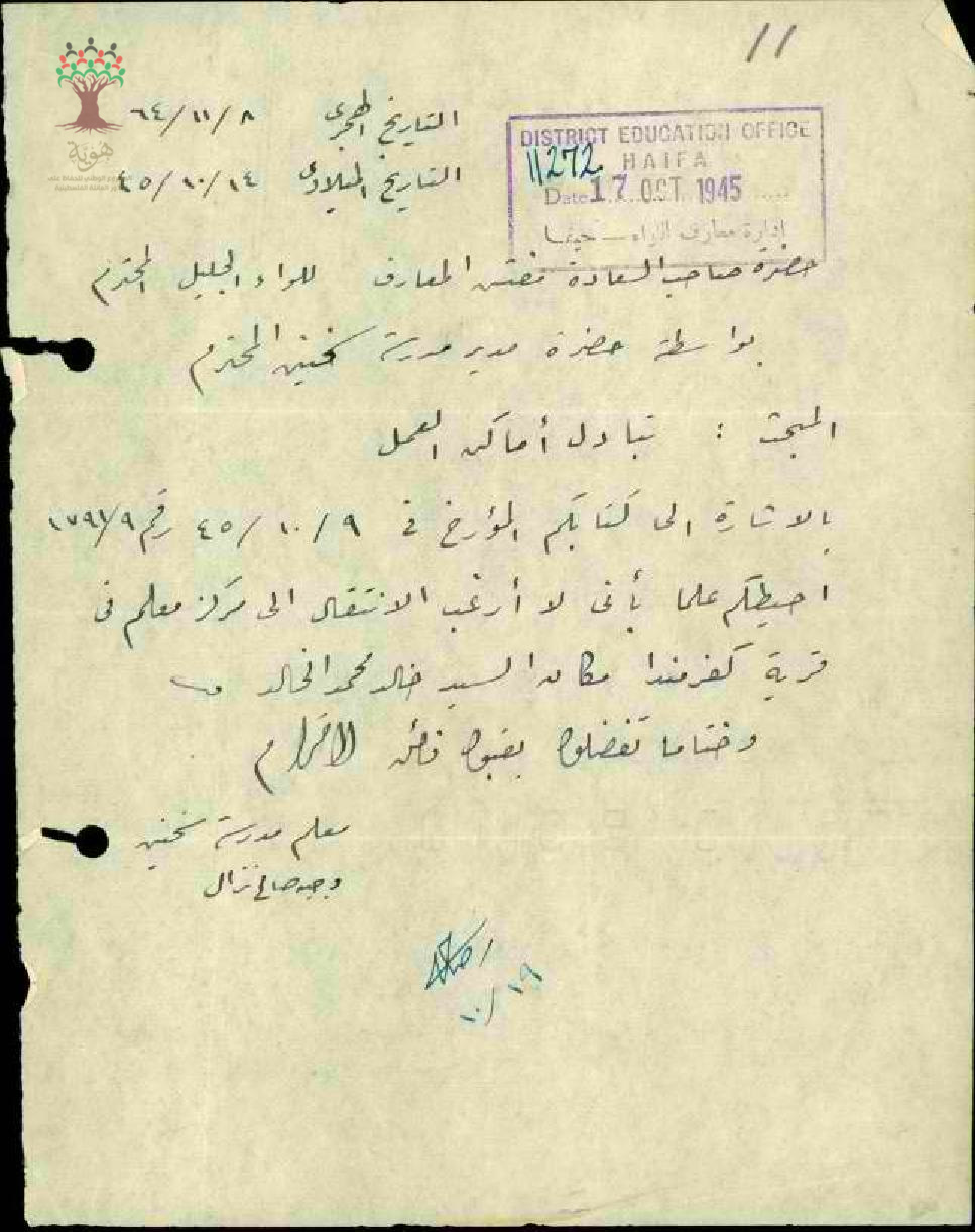 رسالة من المعلم وجيه نزال الى مفتش المعارف يخبره بعدم رغبته في الانتقال الى كفرمندا