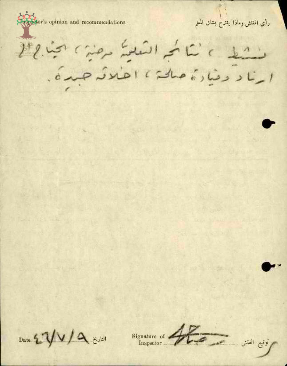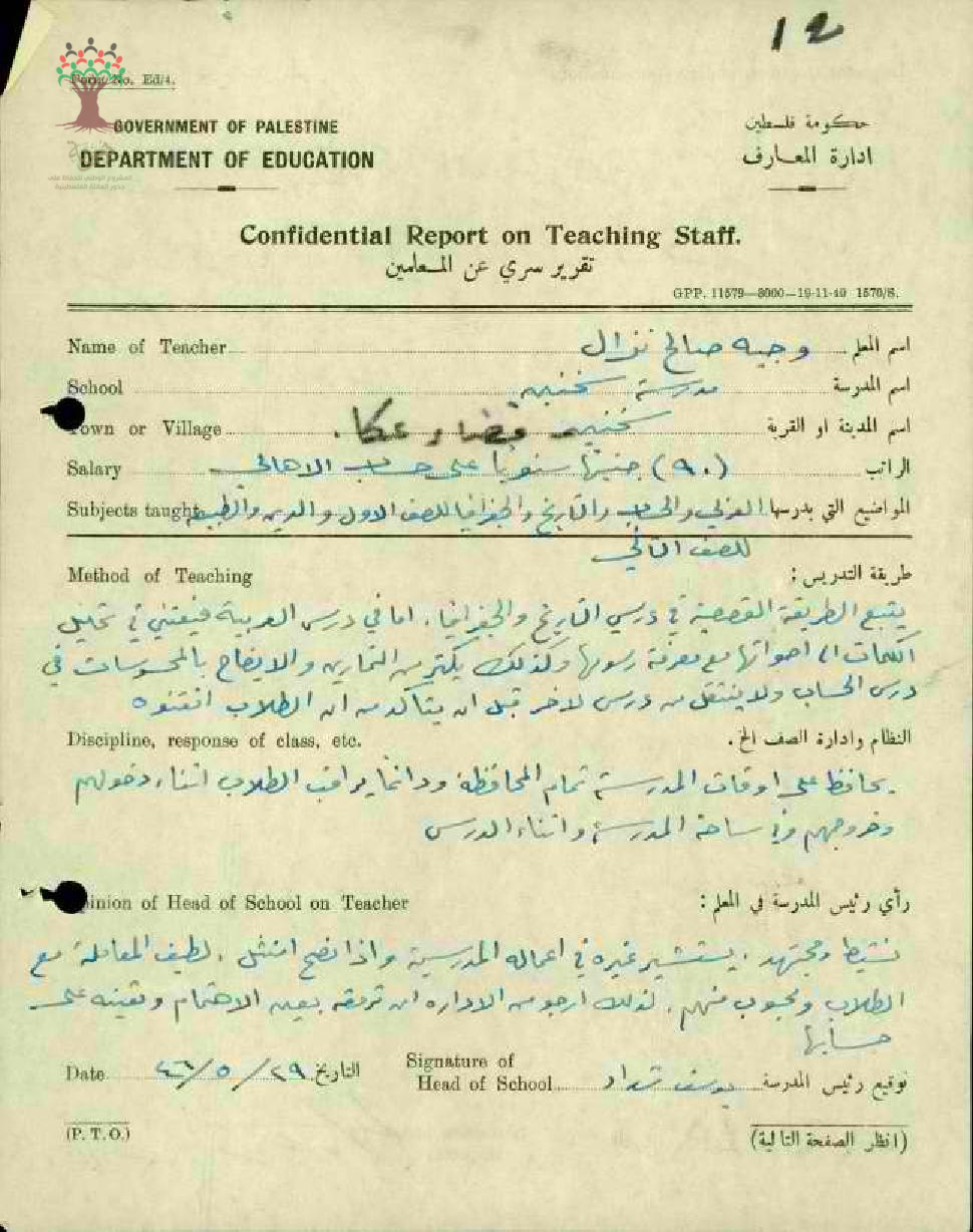 تقرير تفصيلي عن أداء المعلم وجيه نزال في مدرسة سخنين سنة 1946
