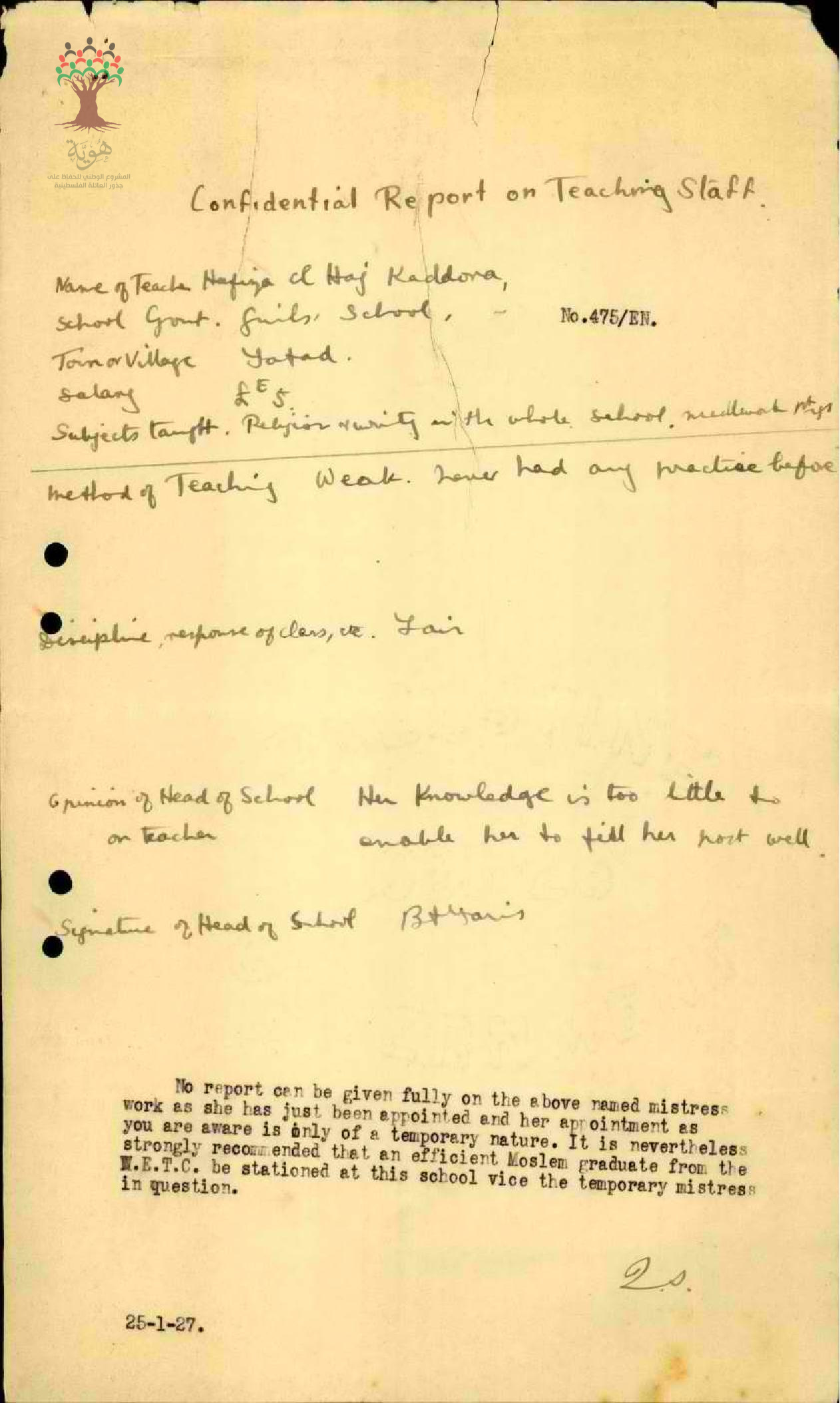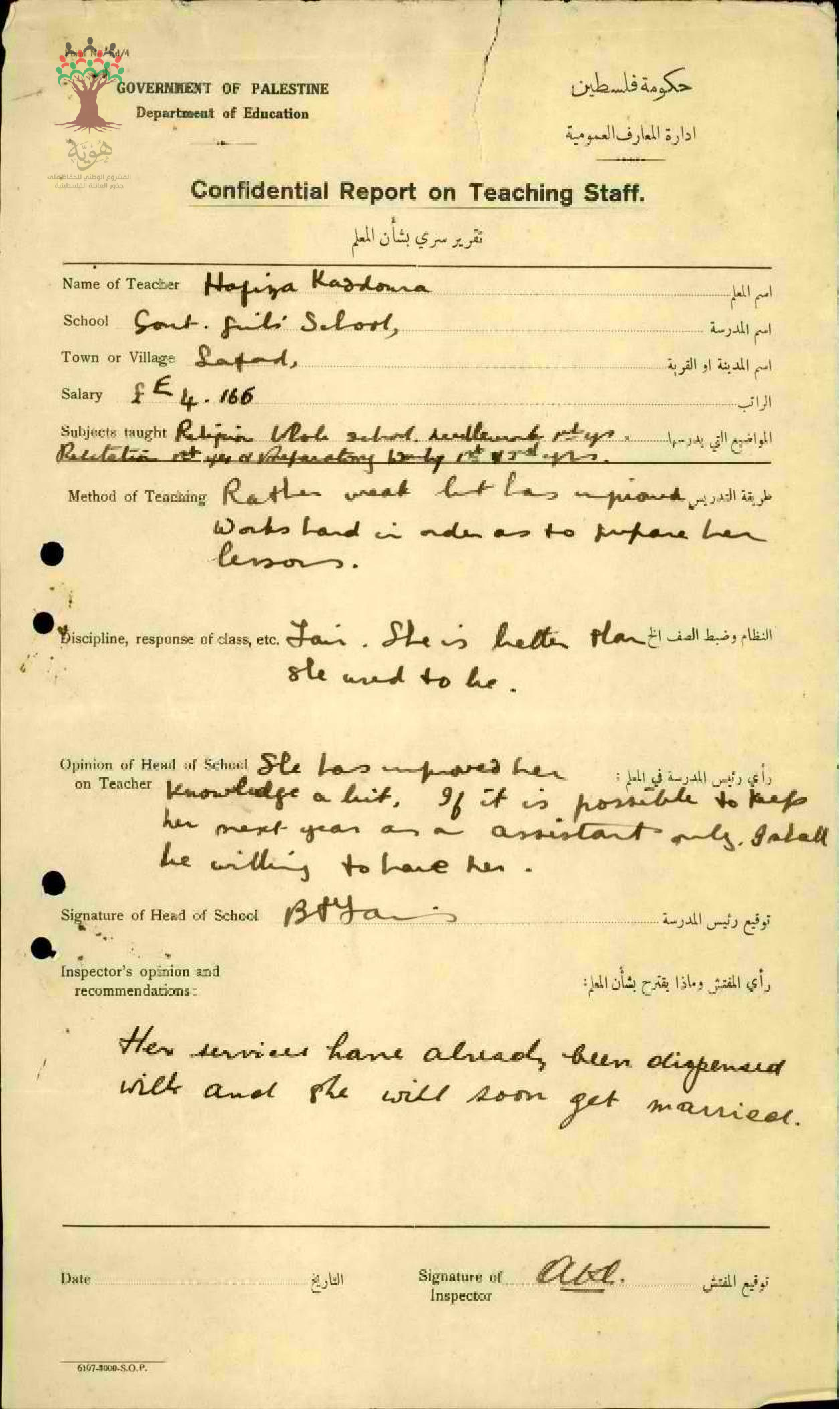 تقرير تفصيلي عن أداء المعلمة حفيظة عبد الرحيم قدورة في مدرسة صفد سنة 1927
