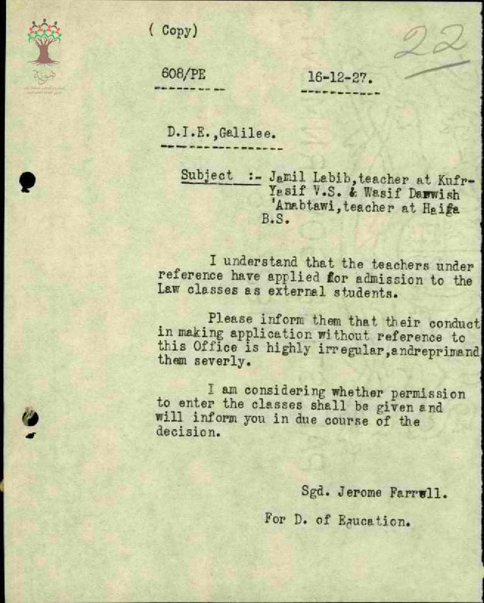 رسالة من مدير المعارف الى مفتش المعارف بخصوص عدم تقديم مراجع مع اوراق التقديم الى مدرسة الحقوق