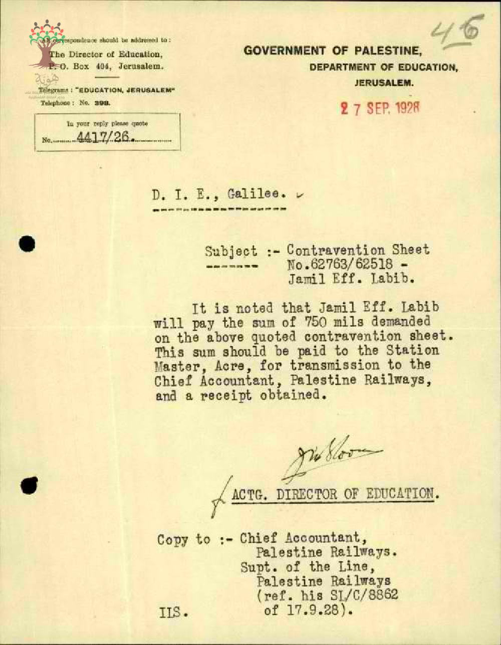 رسالة من مدير المعارف الى مفتش المعارف بخصوص دفع المعلم جميل خوري مخالفته الى مفتش سكة الحديد