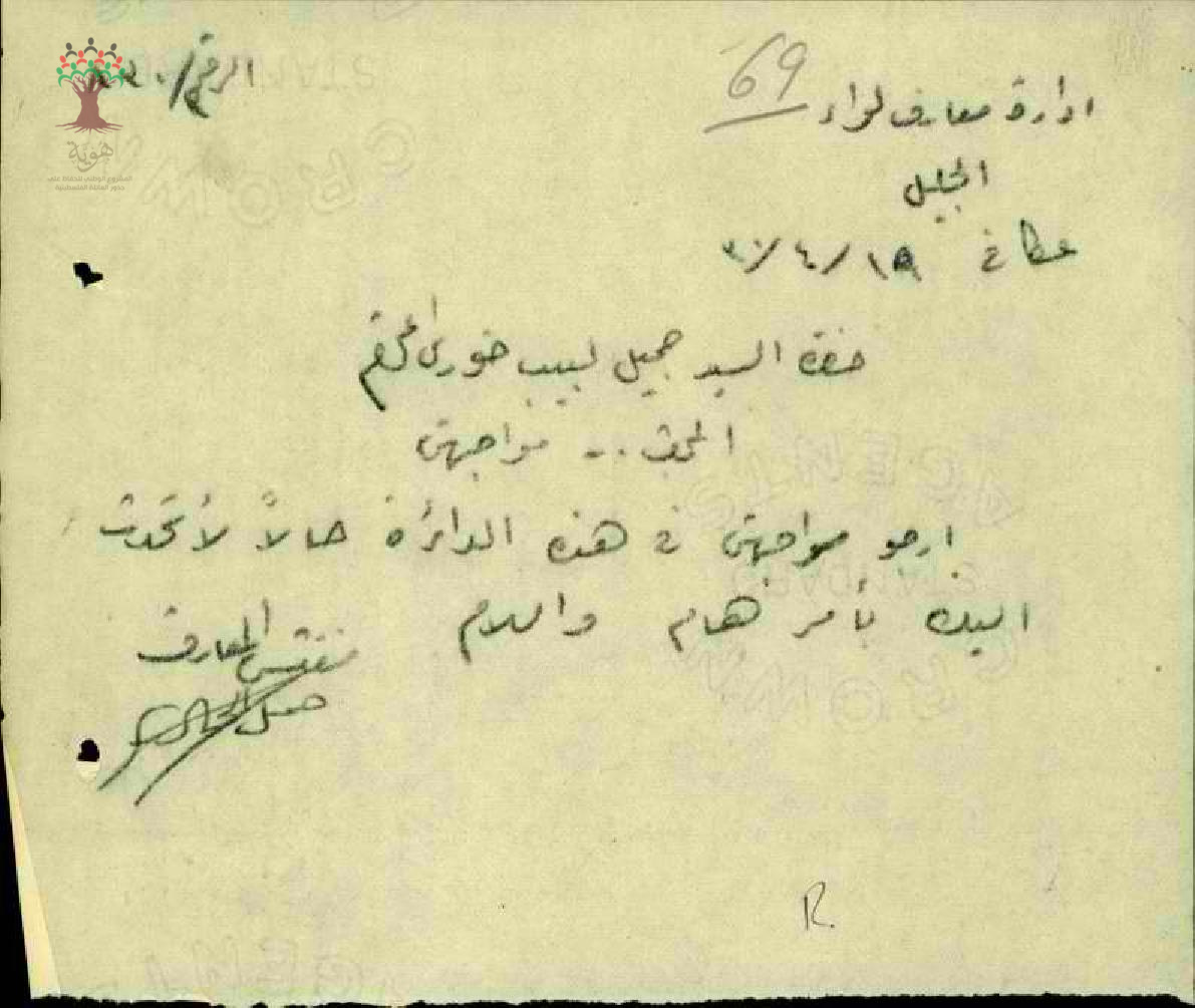 رسالة من مفتش المعارف الى المعلم جميل خوري يطلب منه الحضور امامه