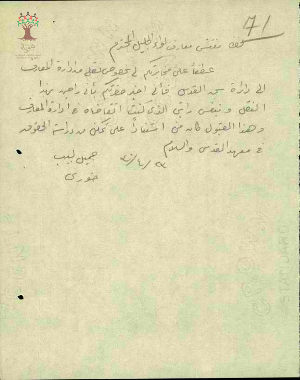رسالة من المعلم جميل خوري الى مفتش المعارف بخصوص نقله الى ادارة سجن القدس