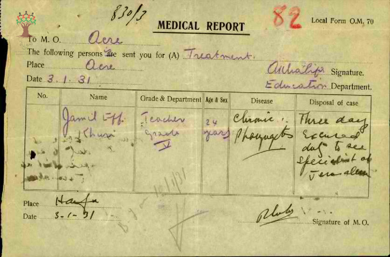 رسالة من مدير مدرسة كفر ياسيف الى مفتش المعارف بخصوص تغيب المعلم جميل خوري بسبب المرض مرفقة بالتقرير الطبي