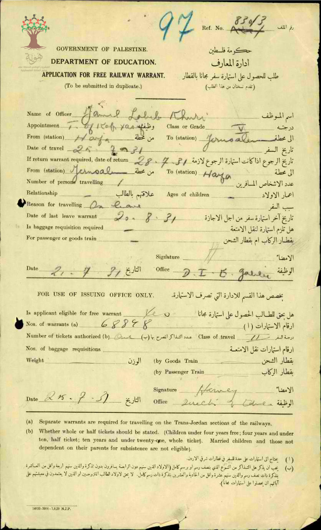 طلب استمارة سفر مقدمة من المعلم جميل خوري/حيفا
