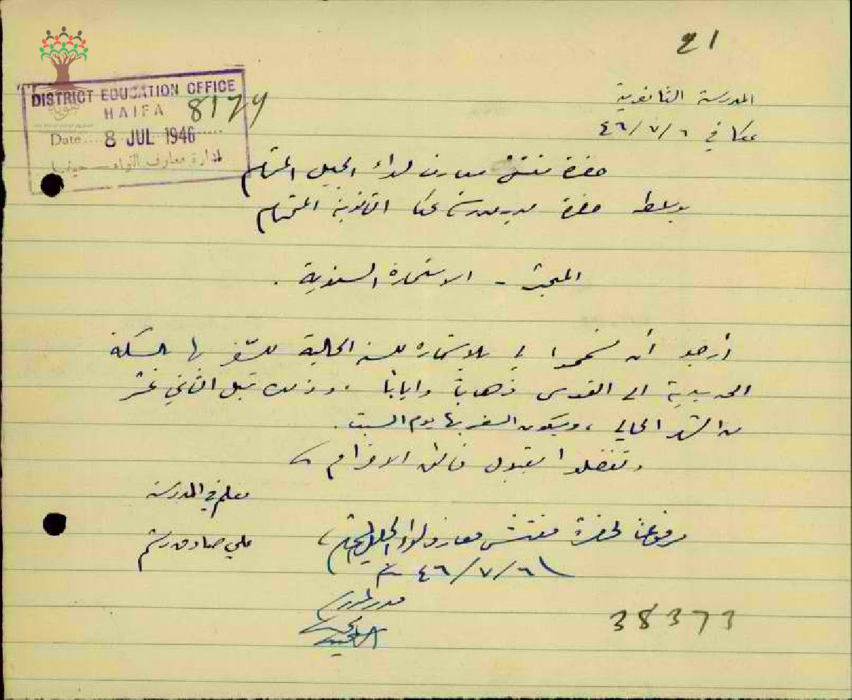 رسالة من المعلم علي رستم الى مفتش المعارف يطلب فيها استمارته السنوية