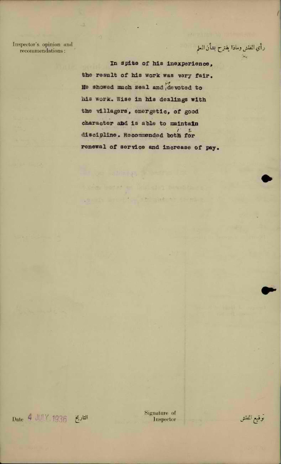 تقرير تفصيلي عن أداء المعلم أحمد ذكرى في مدرسة جبع سنة 1936