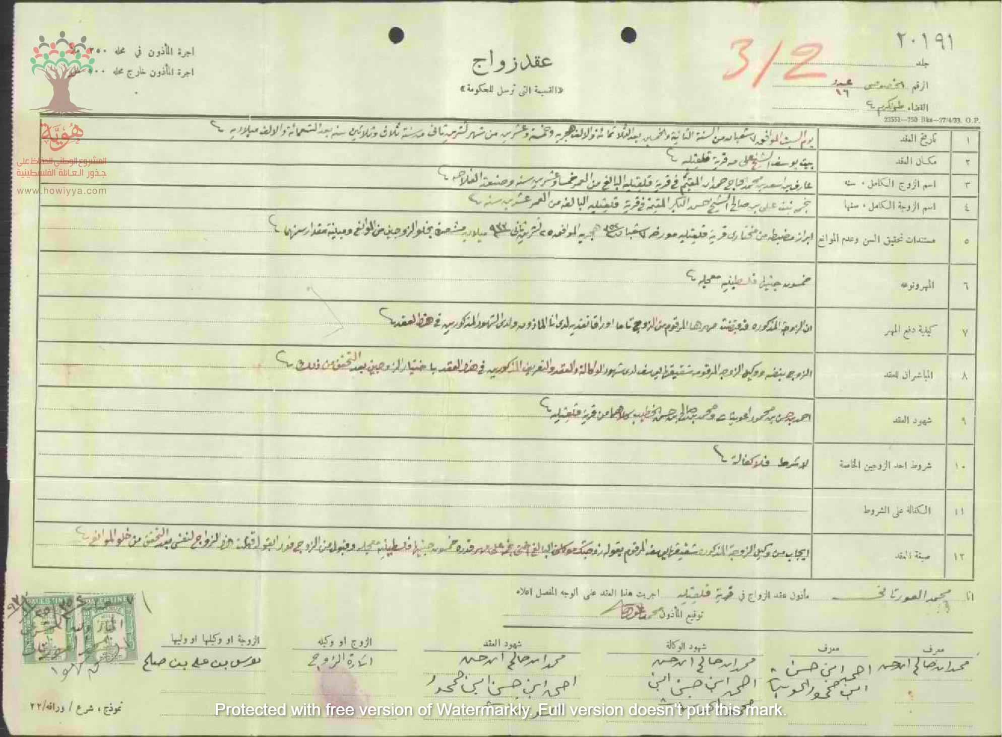 عقد زواج: عارف حمدان نجمة الشيخ حسن - قلقيلية