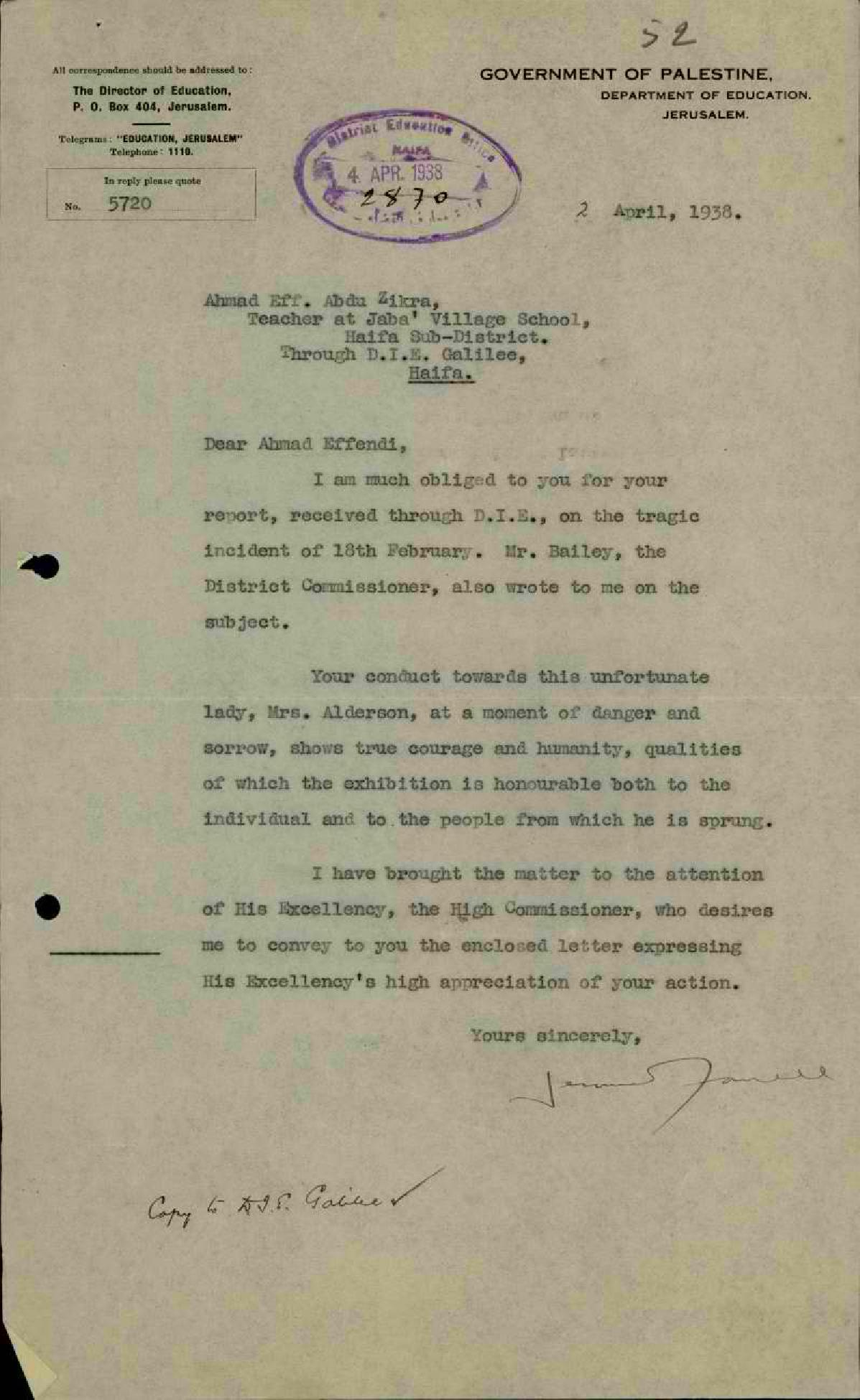 رسالة من المعلم أحمد ذكرى إلى مفتش المعارف يخبره عن حادثة اطلاق النار