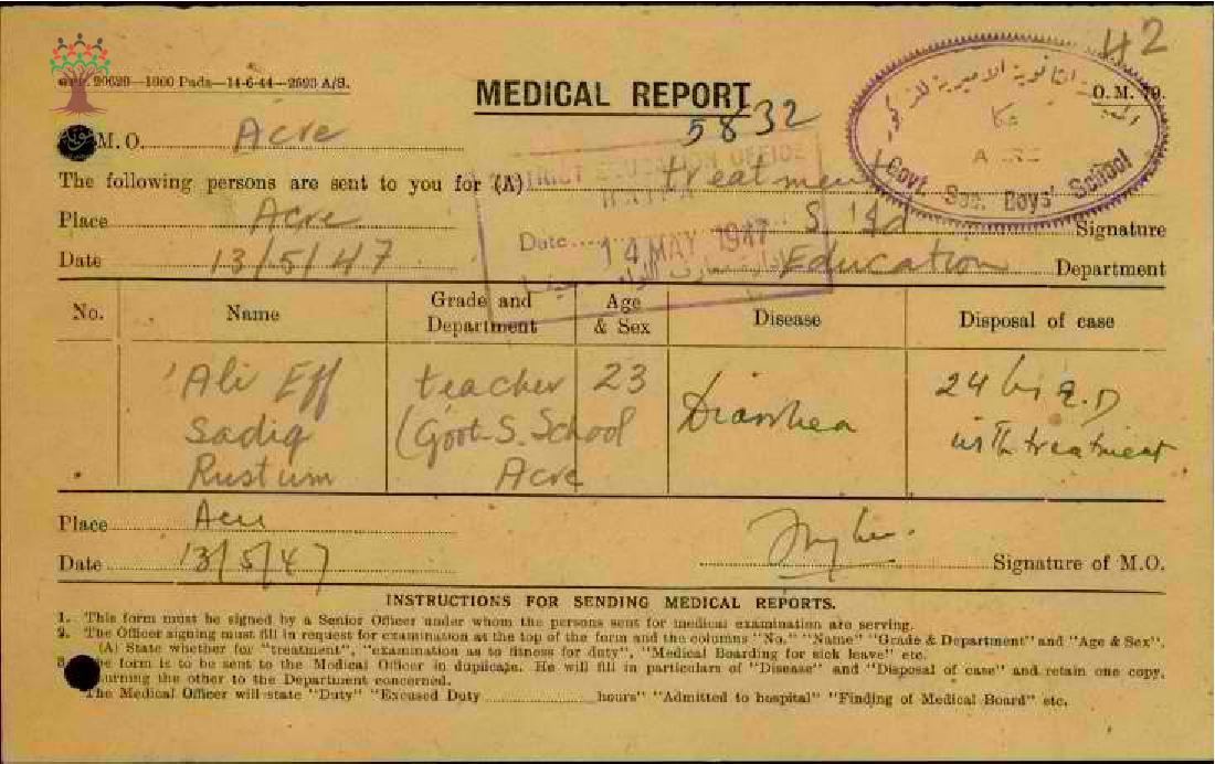 رسالة من مدير مدرسة عكا الثانوية الى مفتش المعارف بخصوص غياب المعام علي رستم مرفقة بتقرير طبي