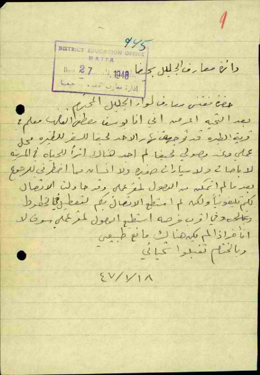 رسالة من المعلم يوسف القاضي الى مفتش المعارف بخصوص تغيبه عن العمل