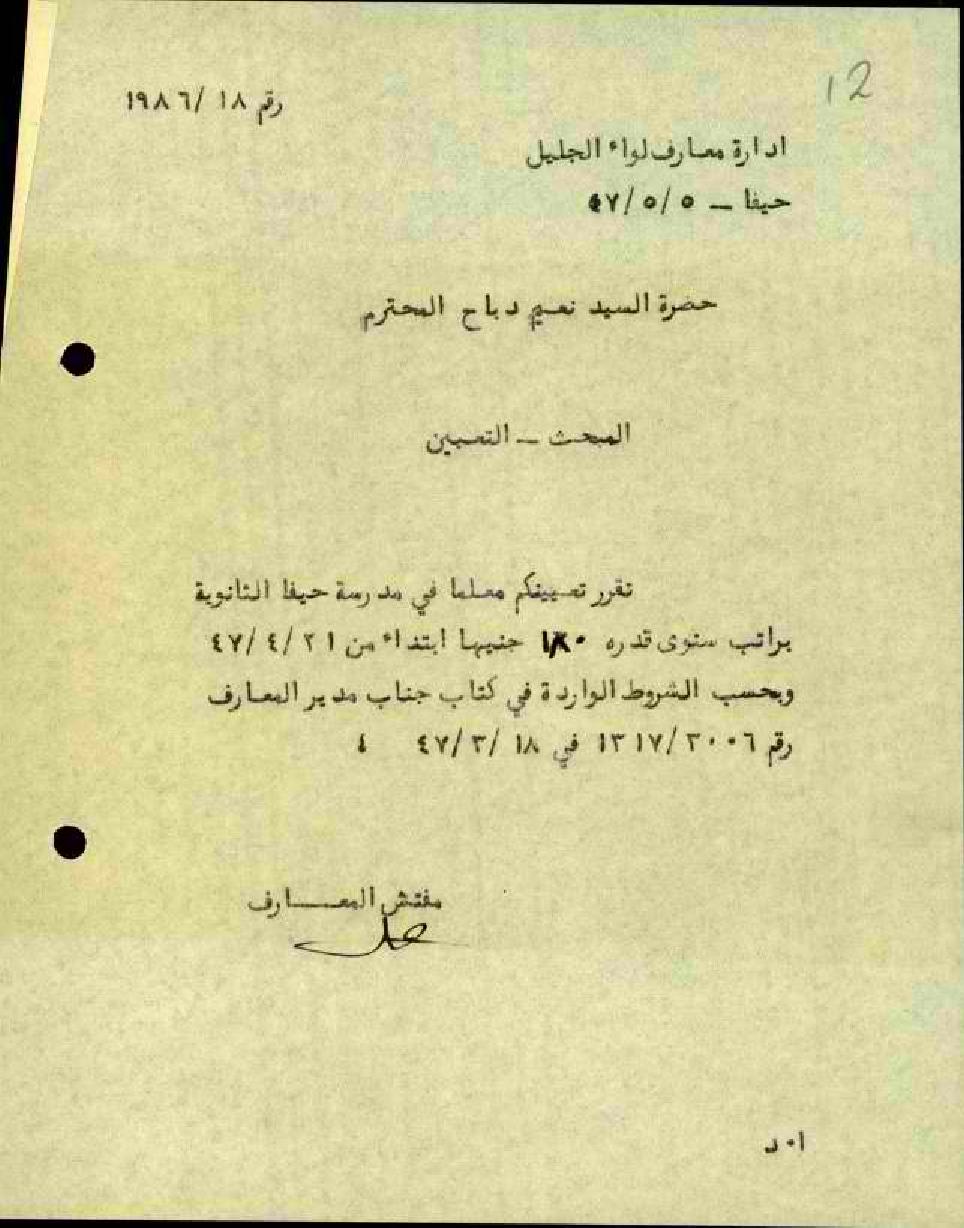 تعيين المعلم نعيم دباح في مدرسة حيفا الثانوية