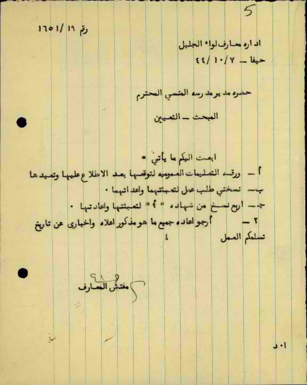 رسالة من مفتش المعارف الى مدير مدرسة المنسي يطلب منه أن يوقع المعلم عبد الرحيم هلال على الأوراق المطلوبة