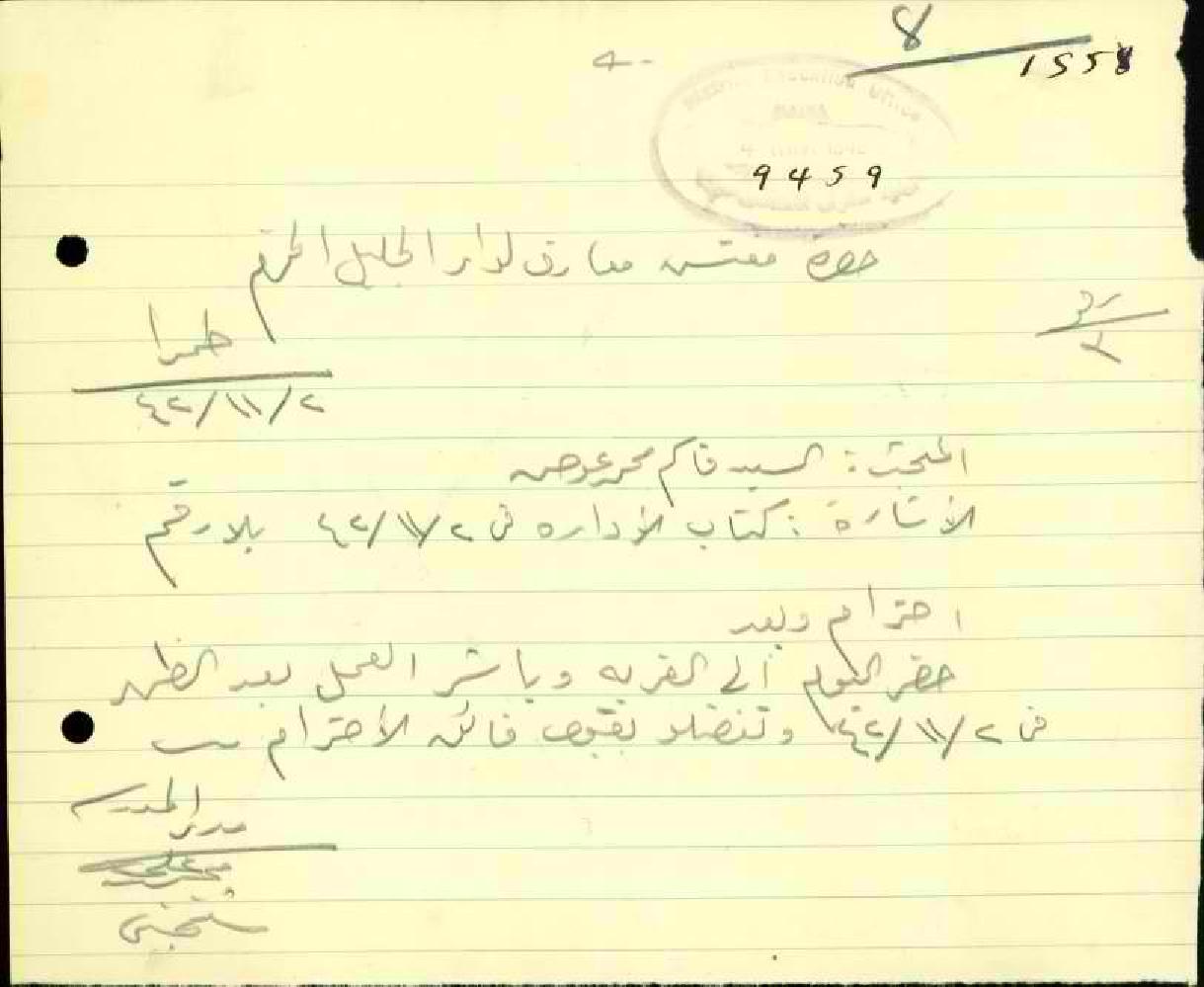 رسالة من مدير مدرسة طمرا الى مفتش المعارف يعلمه أن المعلم قاسم حميد قد باشر عمله