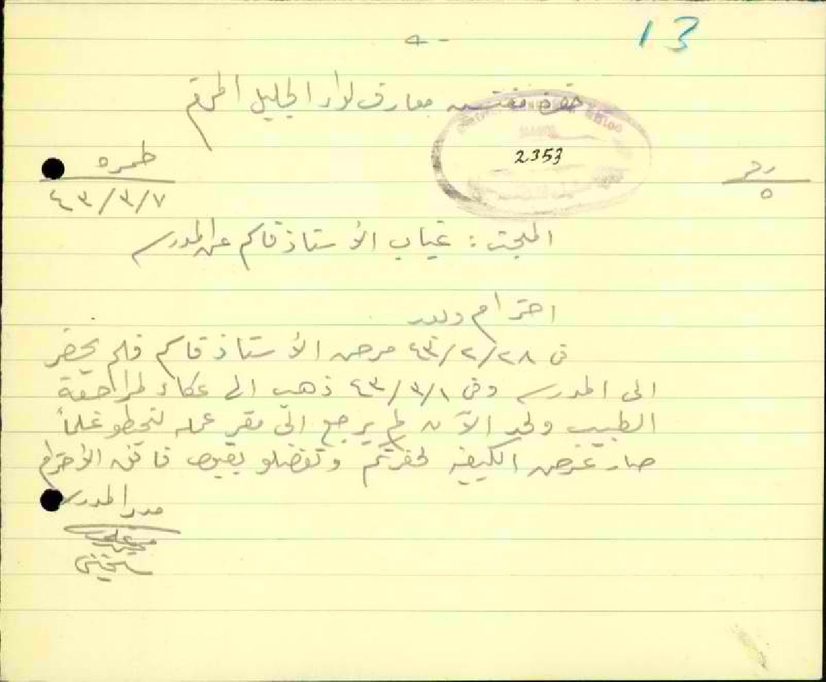 رسالة من مدير مدرسة طمرا الى مفتش المعارف بخصوص تغيب المعلم قاسم حميد وعدم عودته لحد 1-3-1942