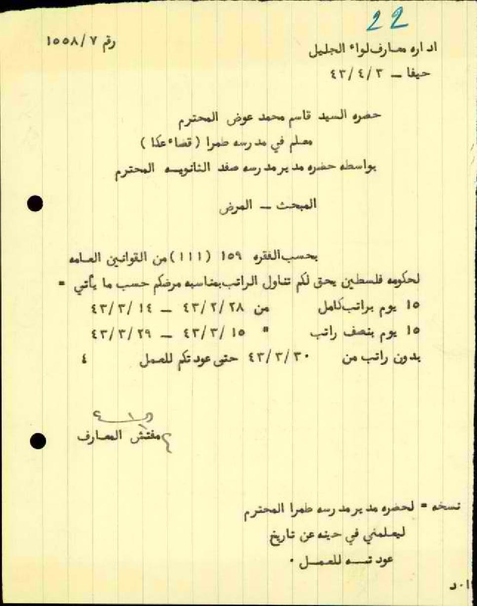 رسالة من مفتش المعارف الى المعلم قاسم حميد بخصوص راتبه