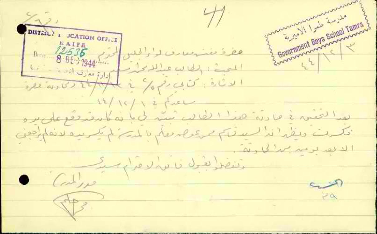 رسالة من مدير مدرسة طمرا الى مفتش المعارف بخصوص حادثة المعلم قاسم حمدي مع أحد الطلاب