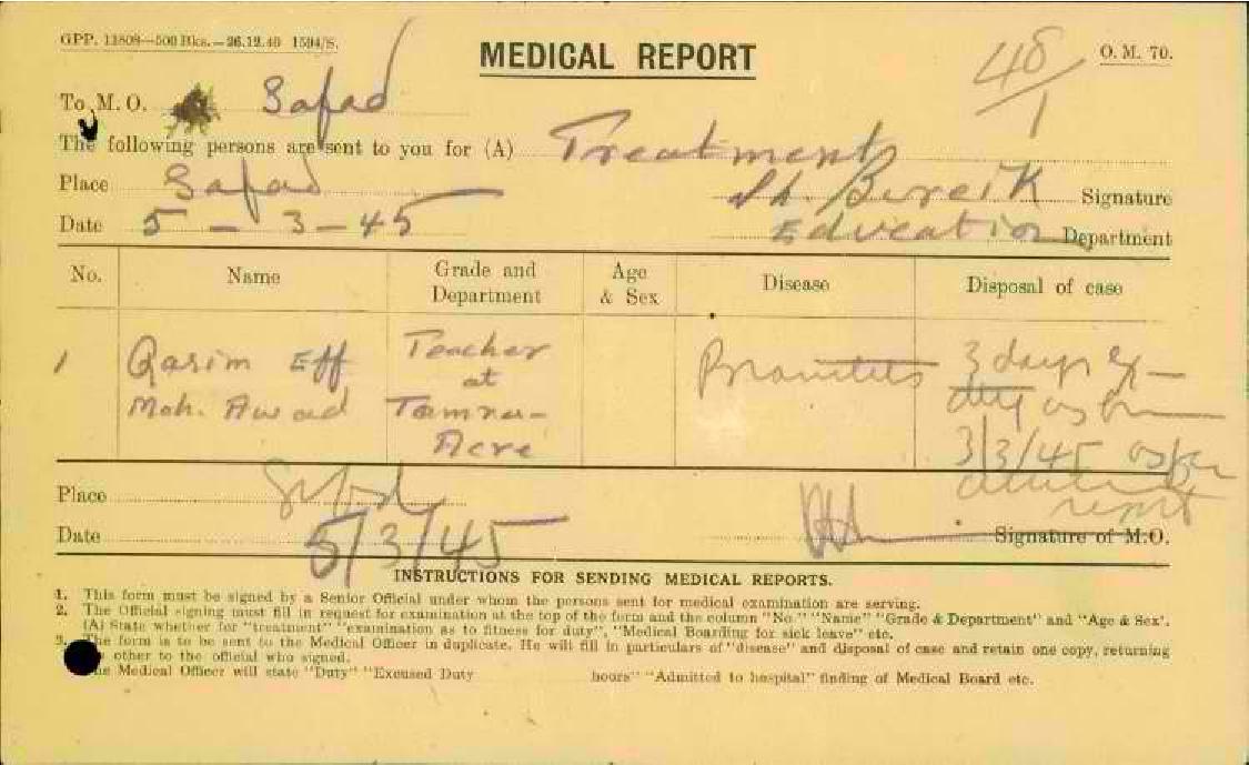 رسالة من مدير مدرسة طمرا الى مفتش المعارف بخصوص تغيب المعلم قاسم حميد وعودته الى العمل مرفقة بالتقرير الطبي