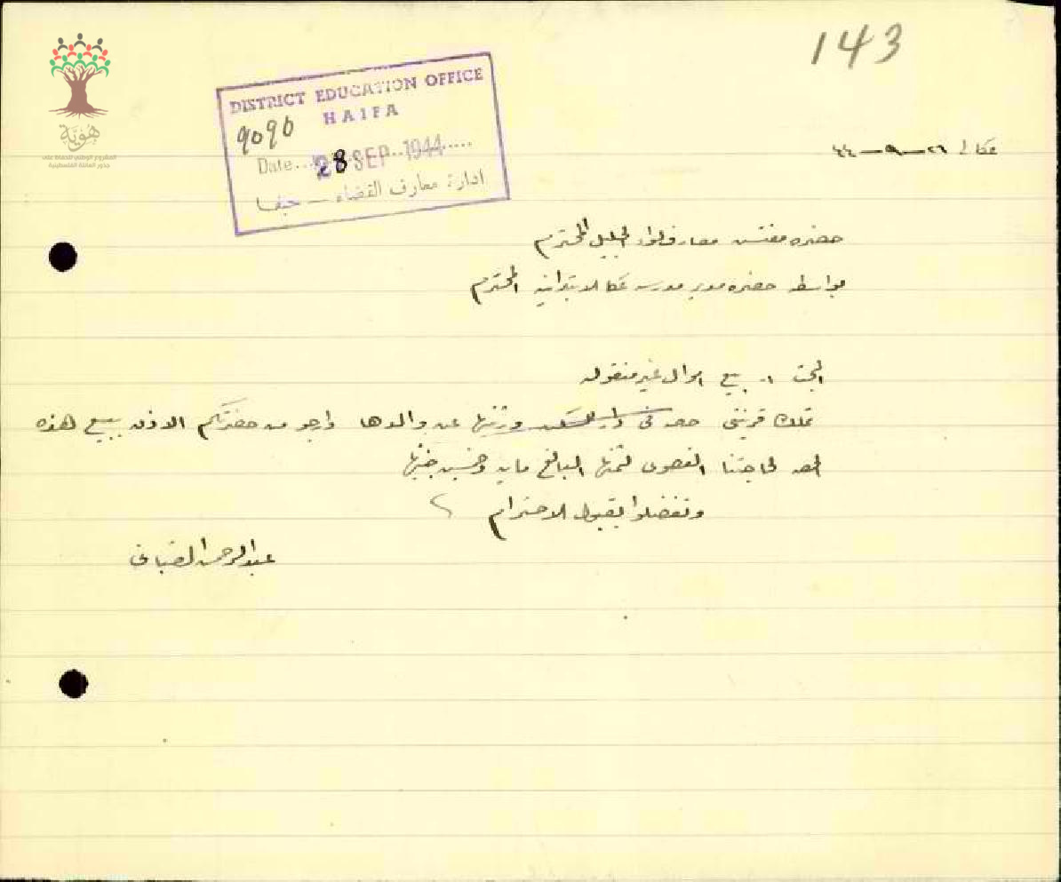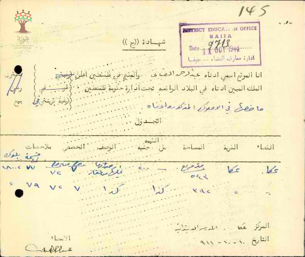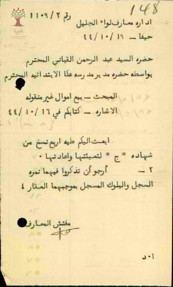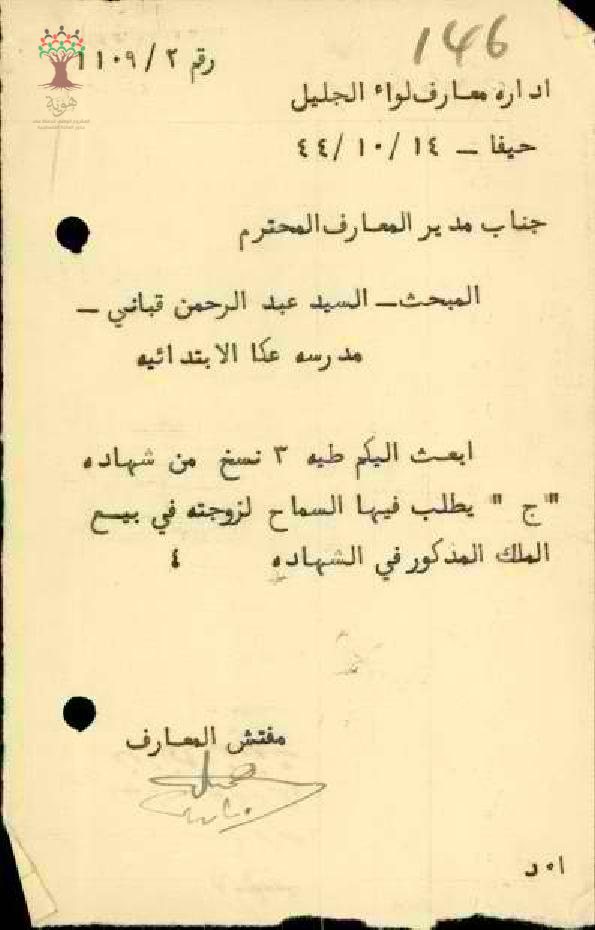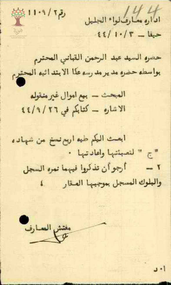 رسالة من المعلم عبد الرحمن قباني إلى مفتش المعارف يبحث معه بيع أموال غير منقولة