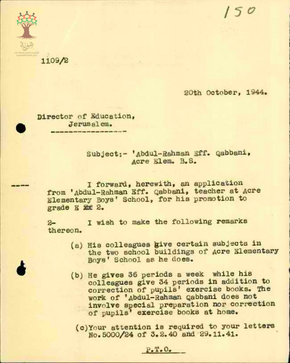 رسالة من مفتش المعارف إلى مدير المعارف يبحث معه أمر طلب المعلم عبد الرحمن قباني ترقيته