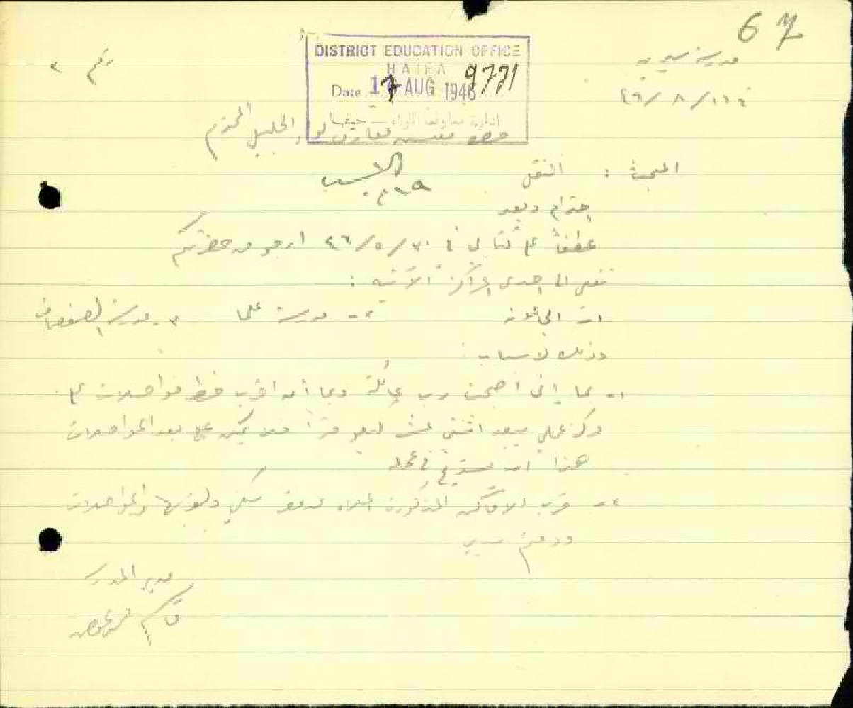 رسالة من المعلم قاسم حميد الى مفتش المعارف يطلب فيها نقله