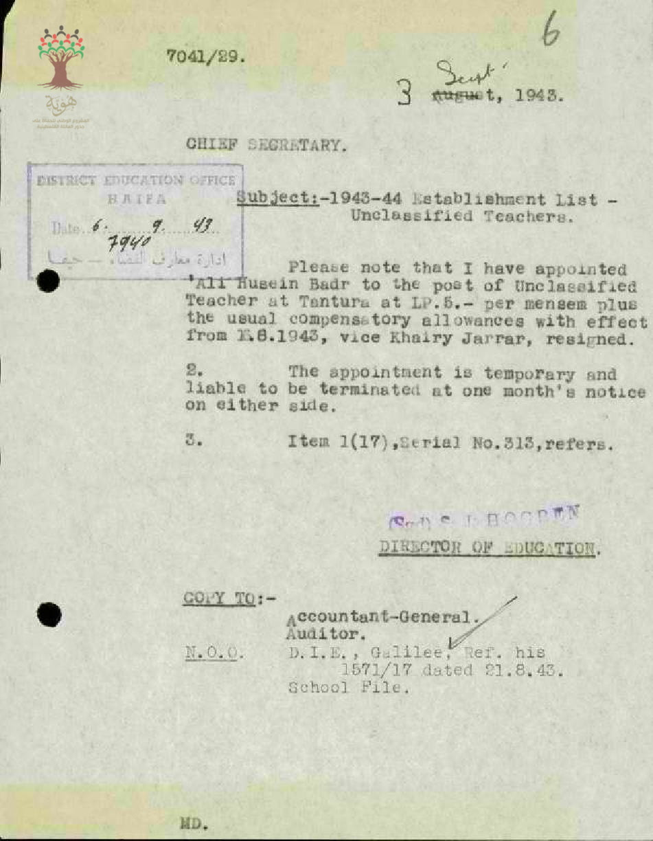 رسالة من مدير المعارف إلى السكرتير العام يخبره بتعيين المعلم علي بدر في الإدارة