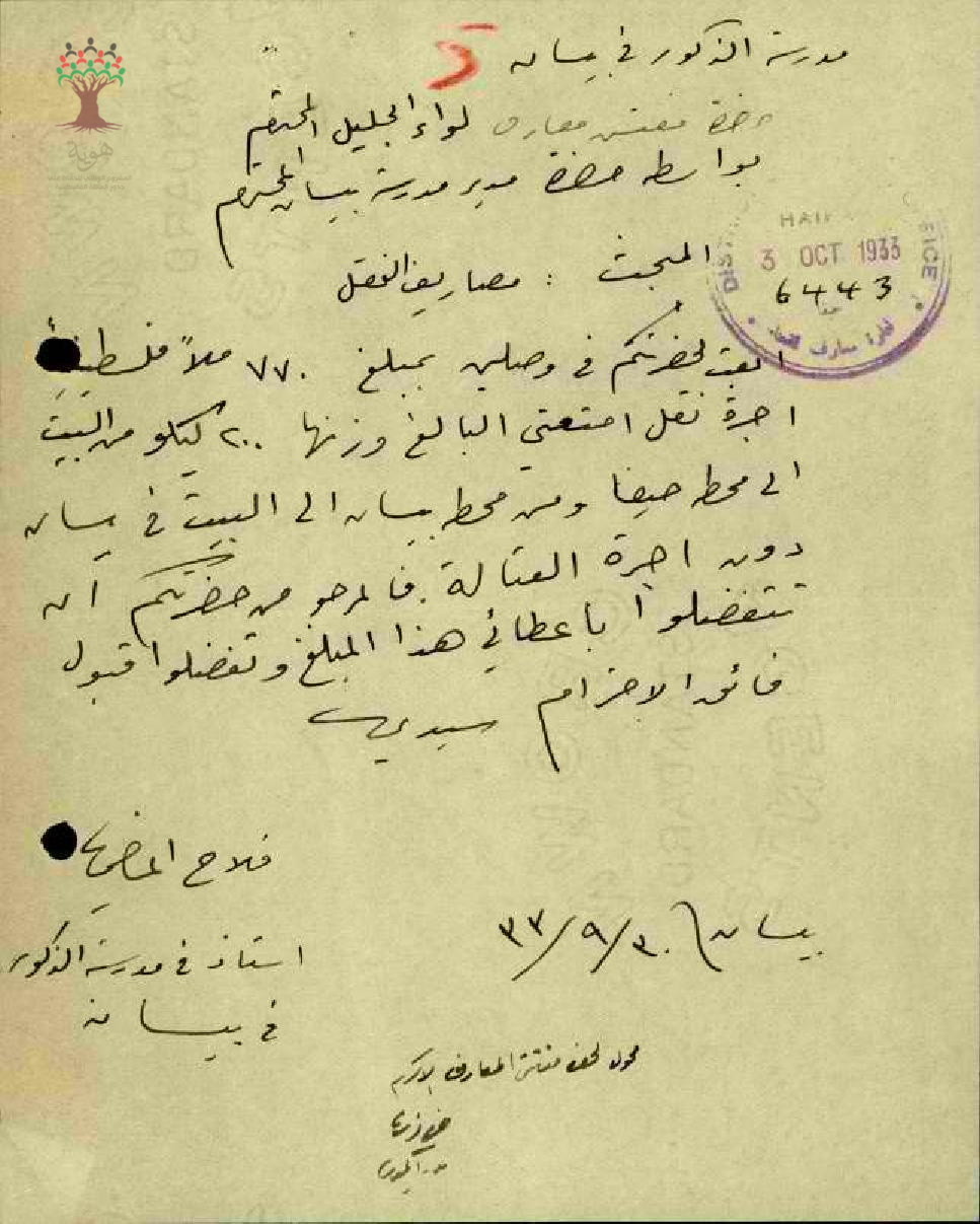 رسالة من المعلم فلاح الماضي الى مفتش المعارف يطلب اجرة نقل متاعه