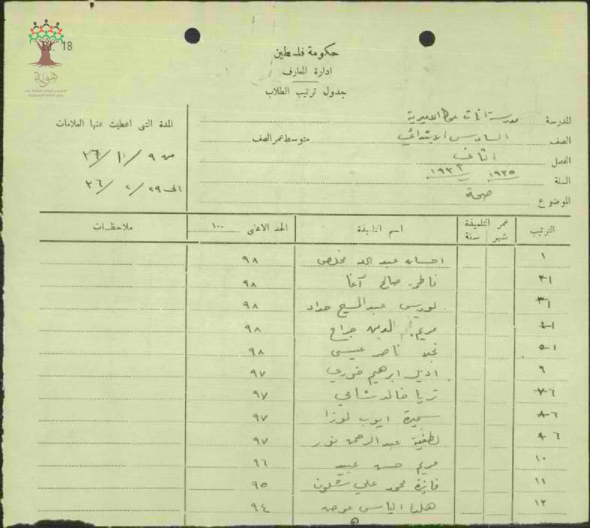 ادارة المعارف جدول ترتيب الطلاب في مدرسة بنات عكا صف السادس الابتدائي