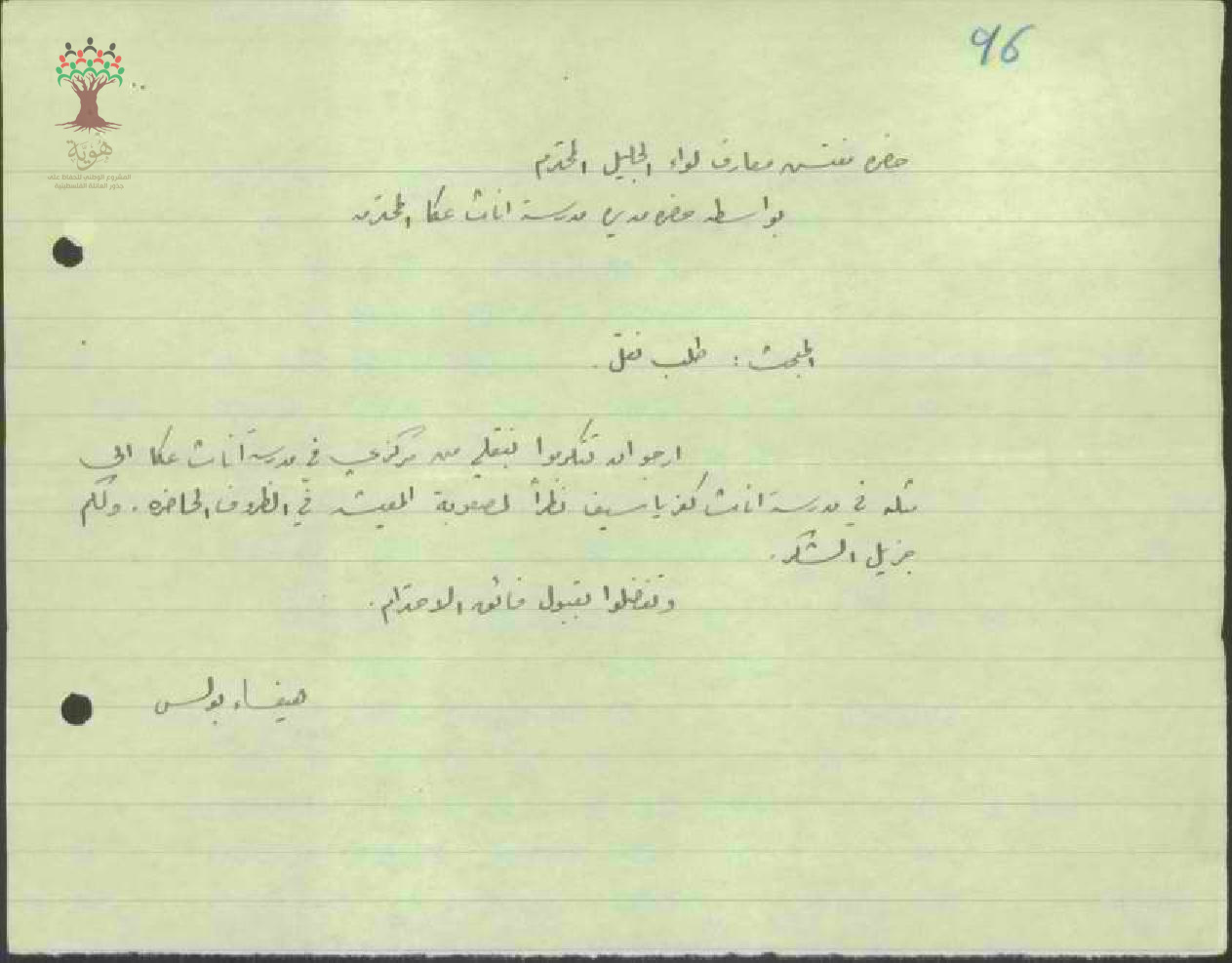 رساله من المعلمه هيفاء بولس الى مفتش معارف لواء الجليل بخصوص طلب نقل من مدرسه بنات عكا الى مدرسه بنات كفر ياسف