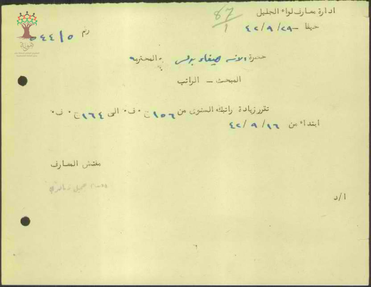 رساله من مفتش المعارف الى المعلمه هيفاء بولس بخصوص زيادة الراتب السنوي
