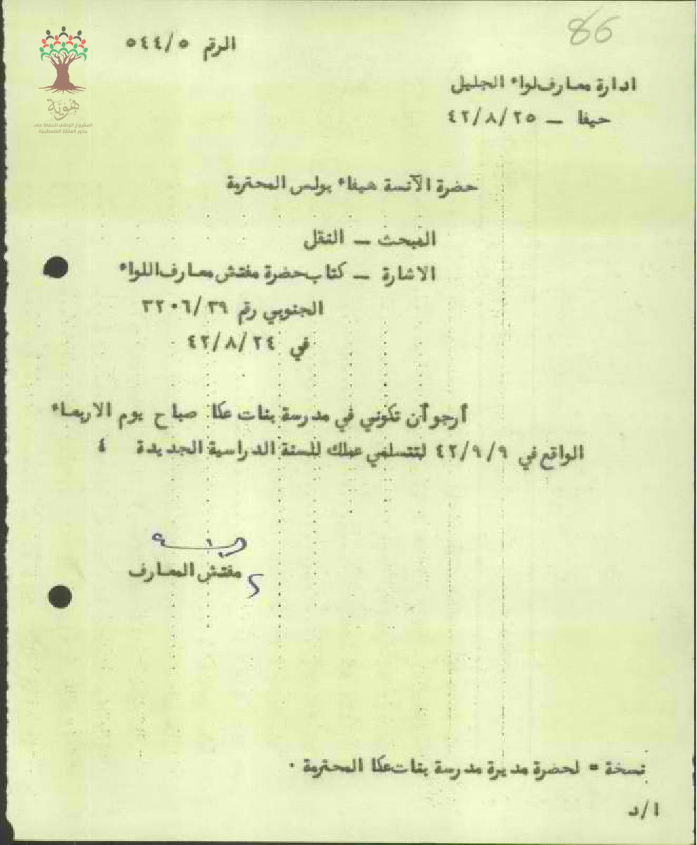رساله من مفتش المعارف الى المعلمه هيفاء بولس بخصوص الذهاب الى مدرسه بنات عكا في صباح يوم الاربعاء لتستلم عملها للسنه الدراسيه الجديدة