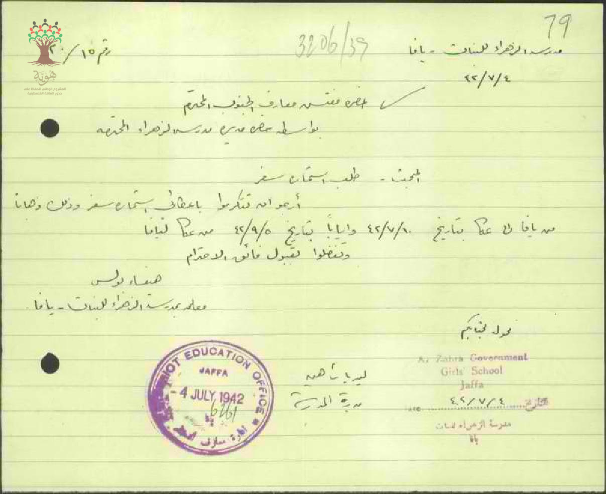 رساله من المعلمه هيفاء بولس الى مفتش المعارف بخصوص اعطائي استمارة سفر بخصوص الذهاب من يافا الى عكا