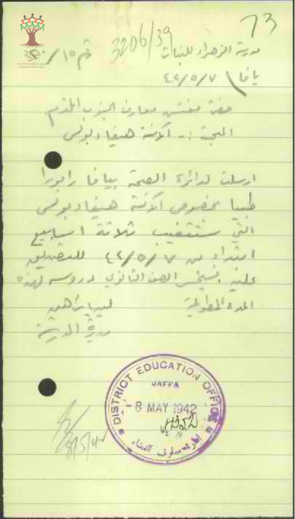 رساله من مديرة المدرسه الى مفتش المعارف بخصوص ارساله رابورا طبيا الى المعلمه هيفاء بولس