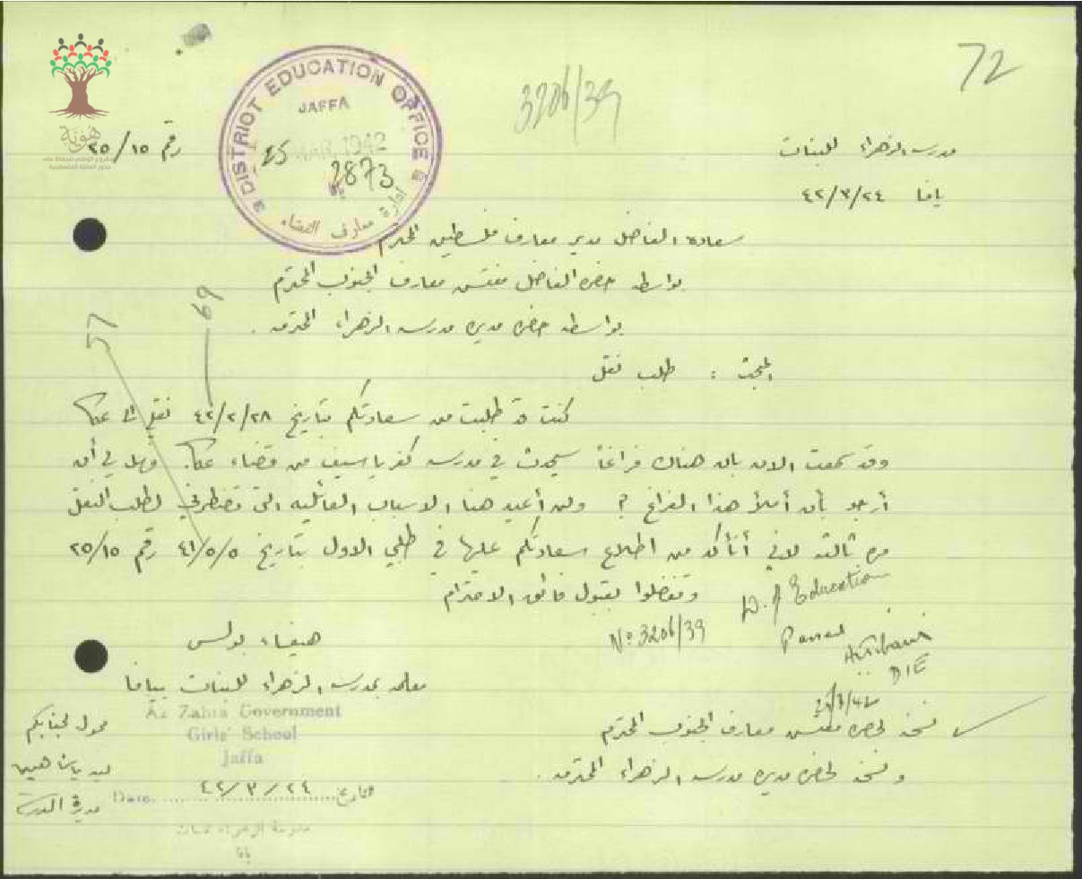 رساله من مديرة المدرسه الى مدير المعارف بخصوص طلب نقل المعلمه هيفاء بولس