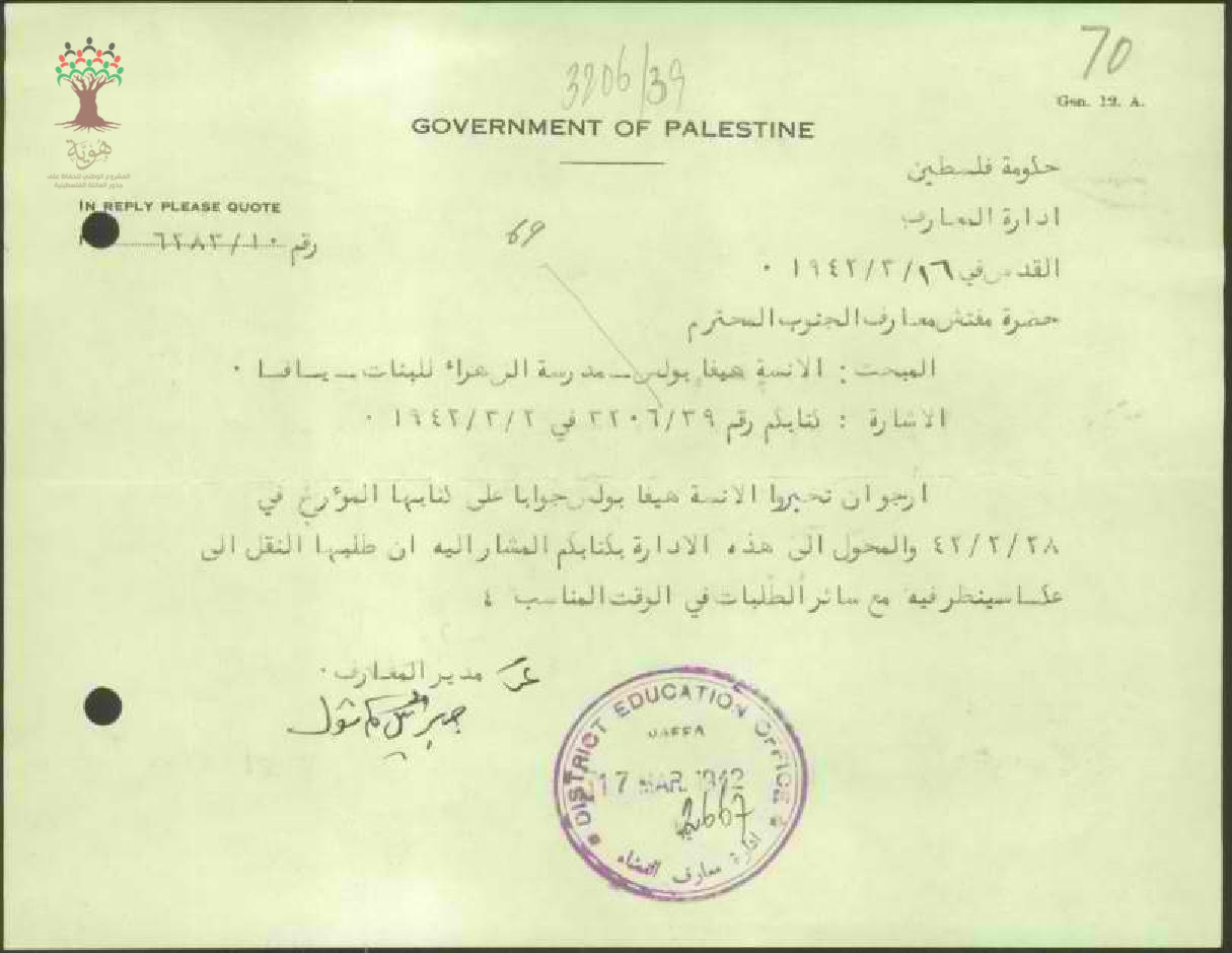 رسال من مدير المعارف الى مفتش المعارف بخصوص النظر على كتاب النقل المعلمه هيفاء بولس