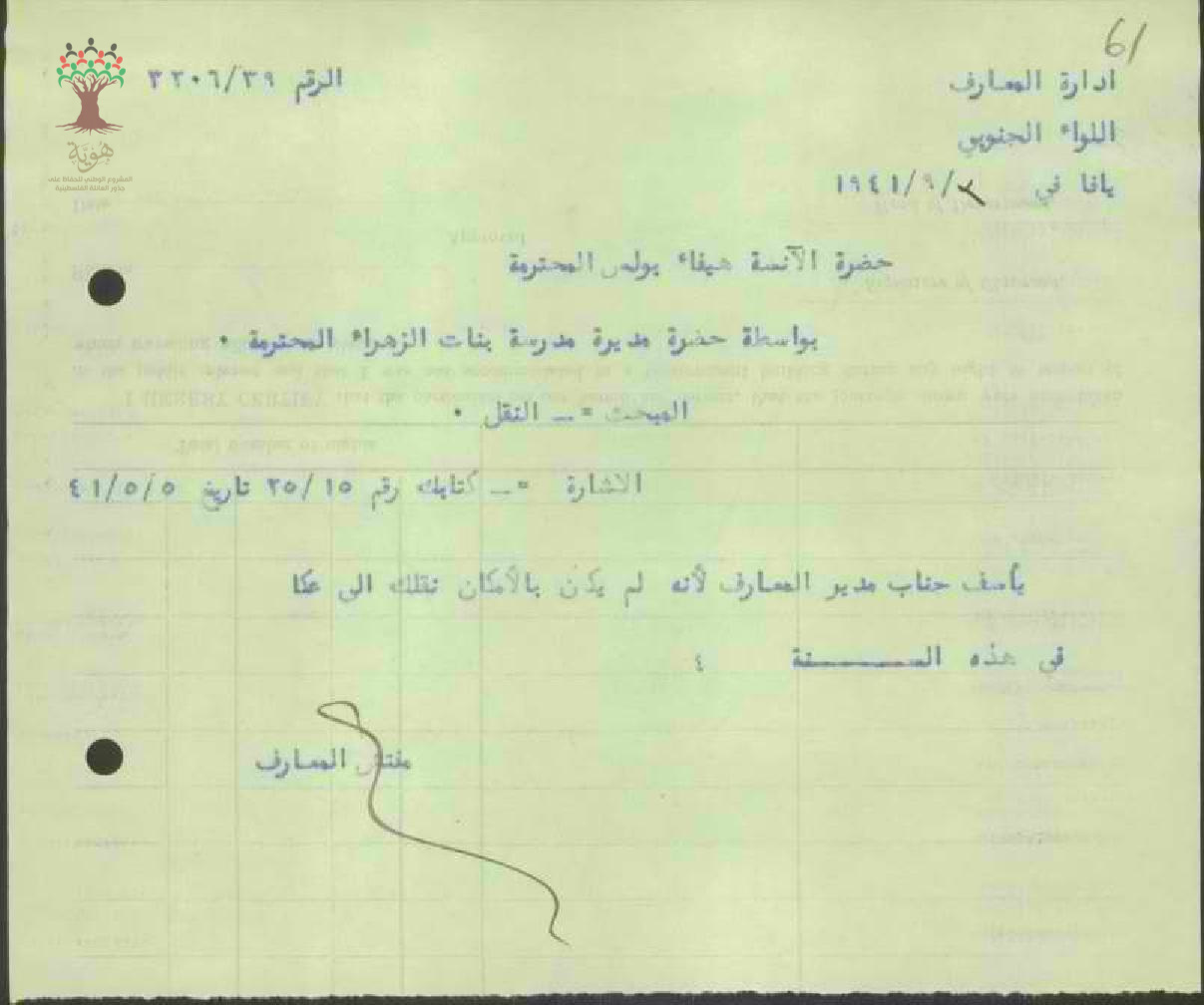رساله من مفتش المعارف الى المعلمه هيغاء بولس بخصوص المبحث النقل وياسف جناب مدير المعارف لانه لم يكن بالامكان نقلك الى عكا في هذه السنه