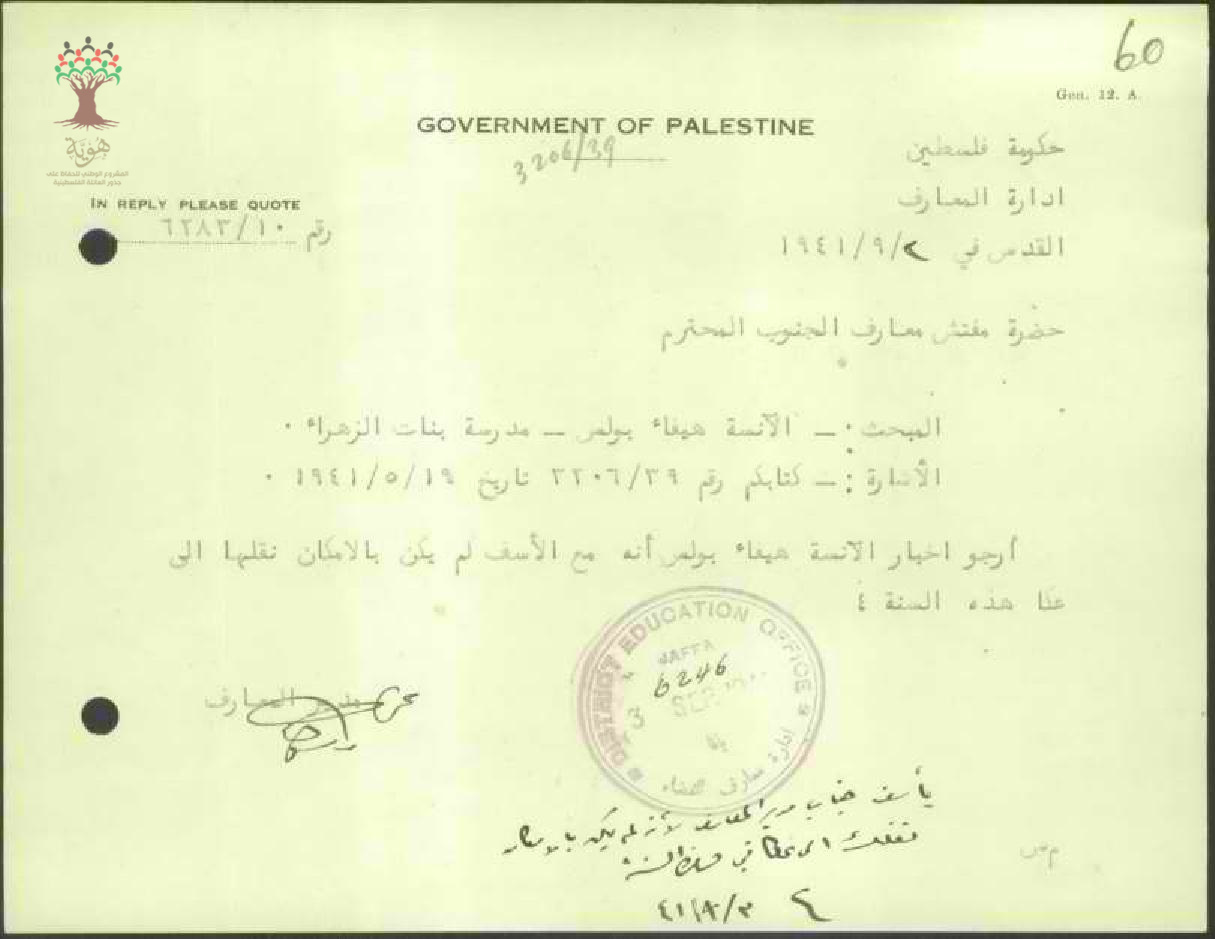 رساله من مدير المعارف الى مفتش معارف الجنوب بخصوص اخبار المعلمه هيفاء بولس مع الاسف لم يكن بالامكان نقلها الى عكا هذي السنه