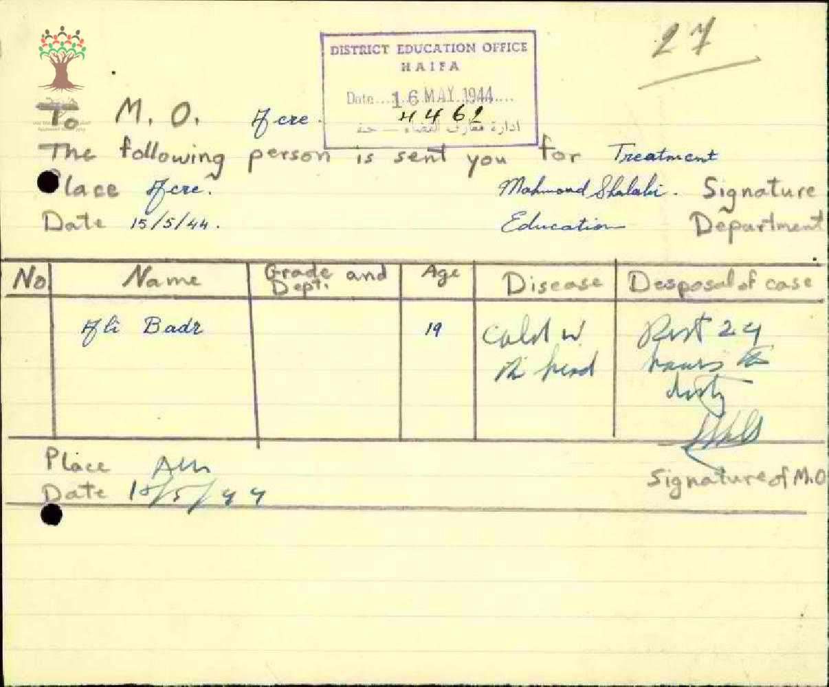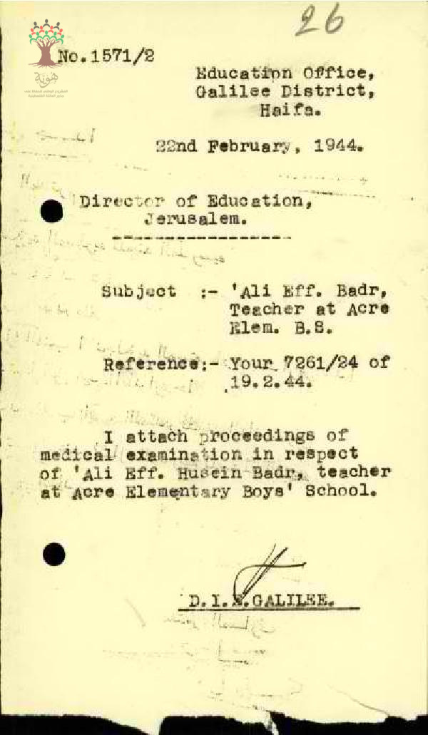 رسالة من مفتش المعارف إلى مدير المعارف يبحث معه غياب المعلم علي بدر مرفقاً التقرير الطبي