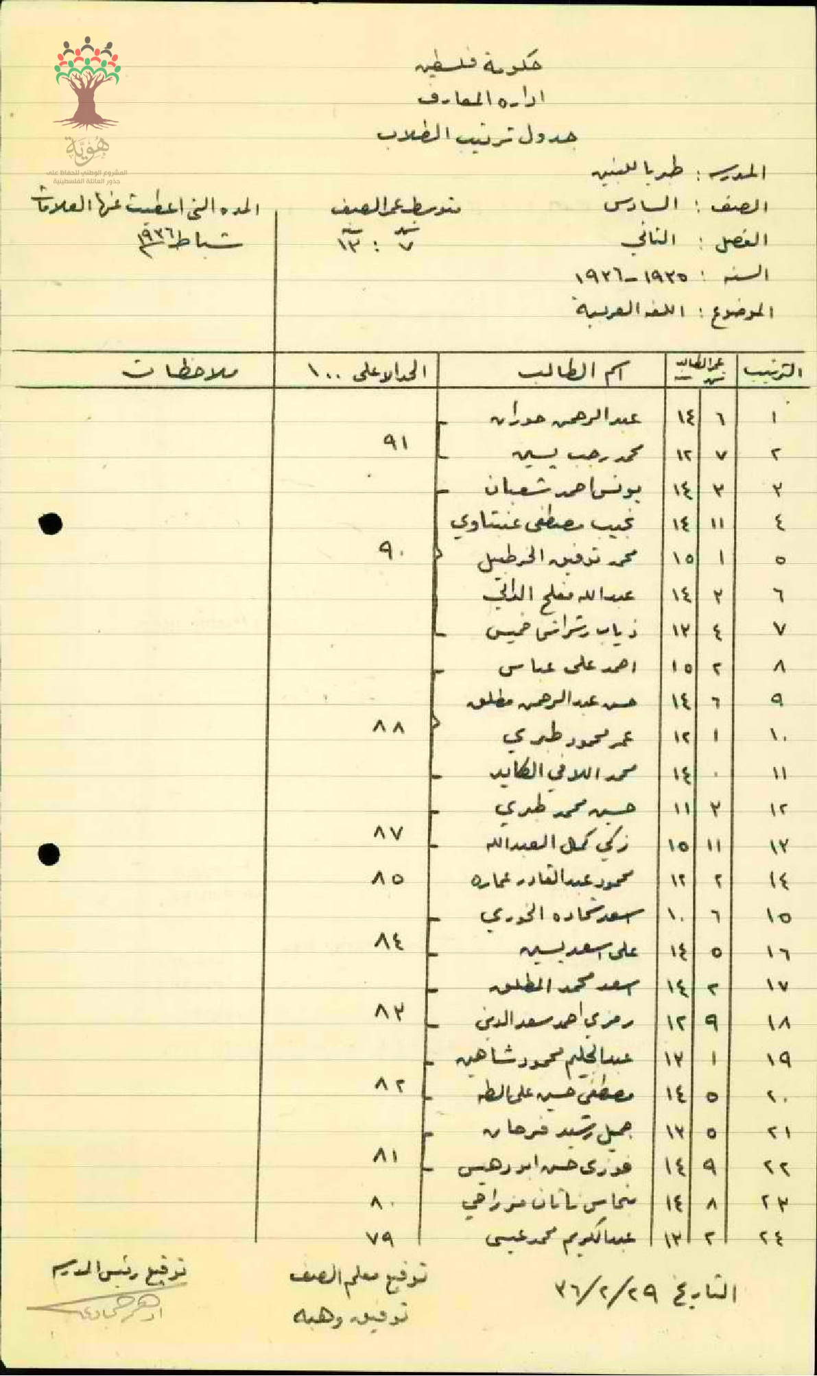 جدول ترتيب الطلاب في مدرسة طبريا للبنين