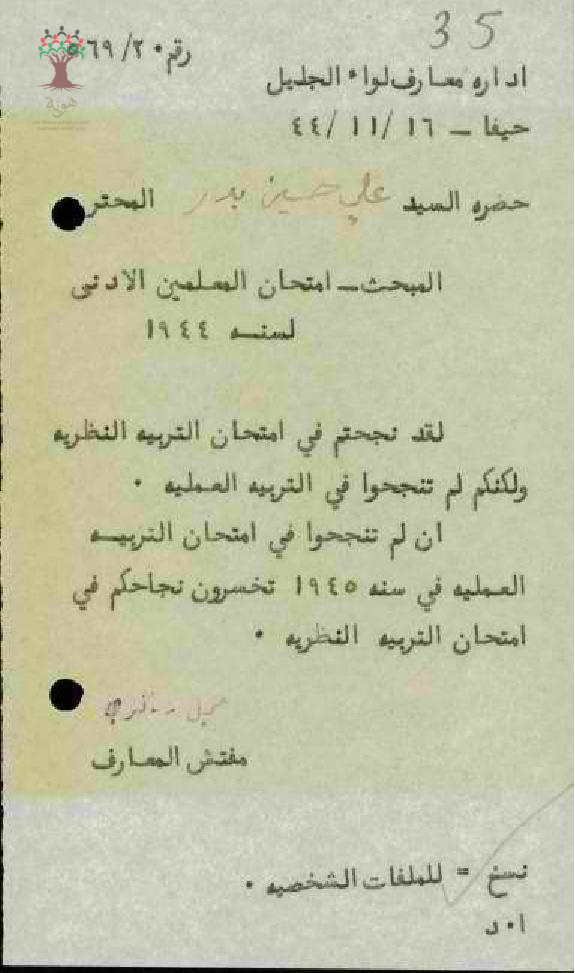 رسالة من مفتش المعارف إلى المعلم علي بدر يخبره بنجاحه في امتحان التربية النظرية