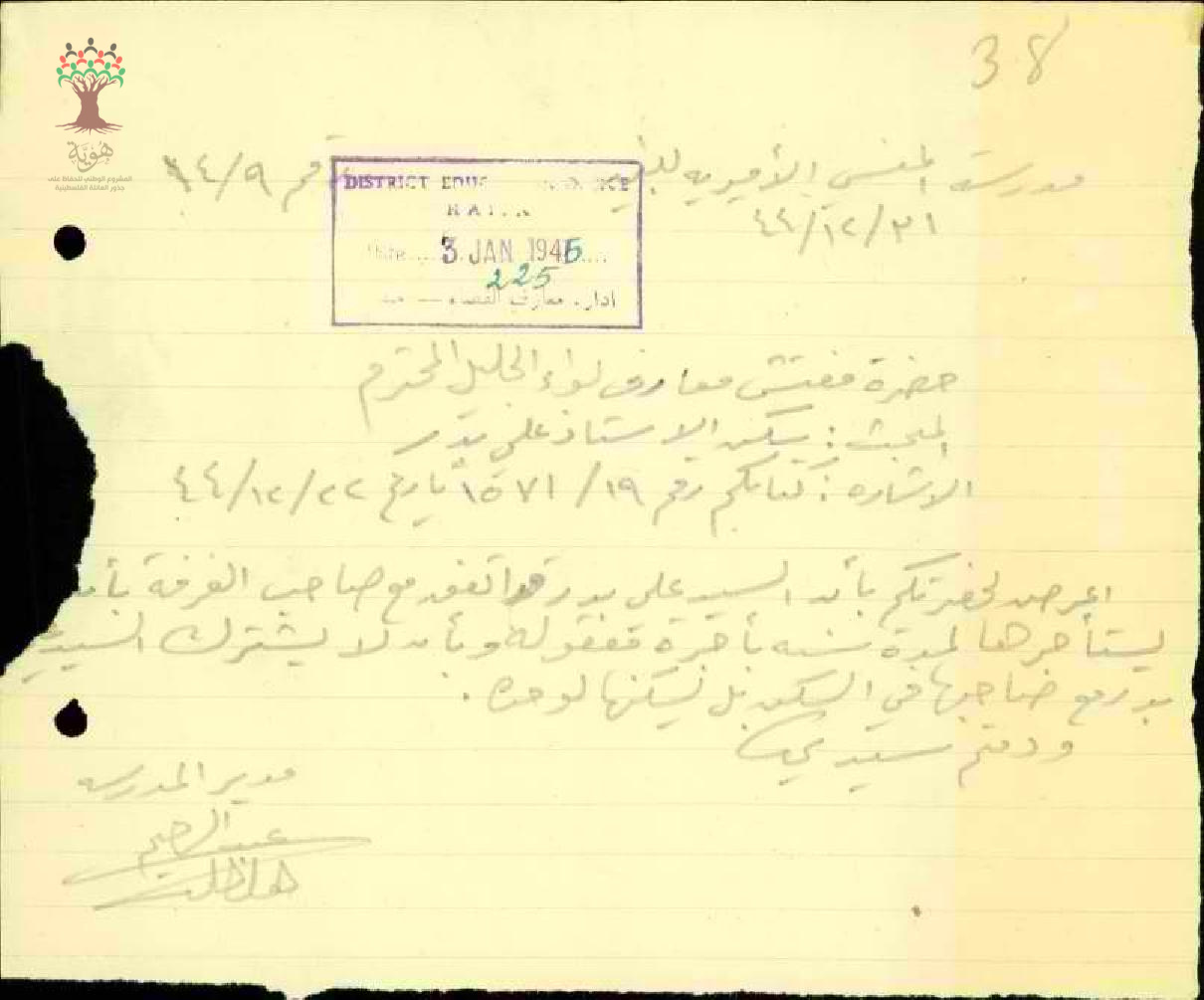 رسالة من مدير مدرسة المنسي إلى مفتش المعارف يخبره عن المعلم علي بدر واستئجاره غرفة لوحده